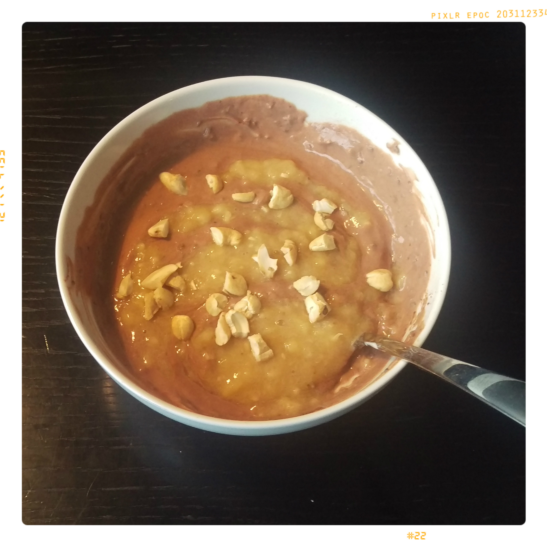 1 kleinere gut reife Banane mit der Gabel pürieren, auf den Joghurt geben, nur leicht mit einer Gabel unterziehen und mit