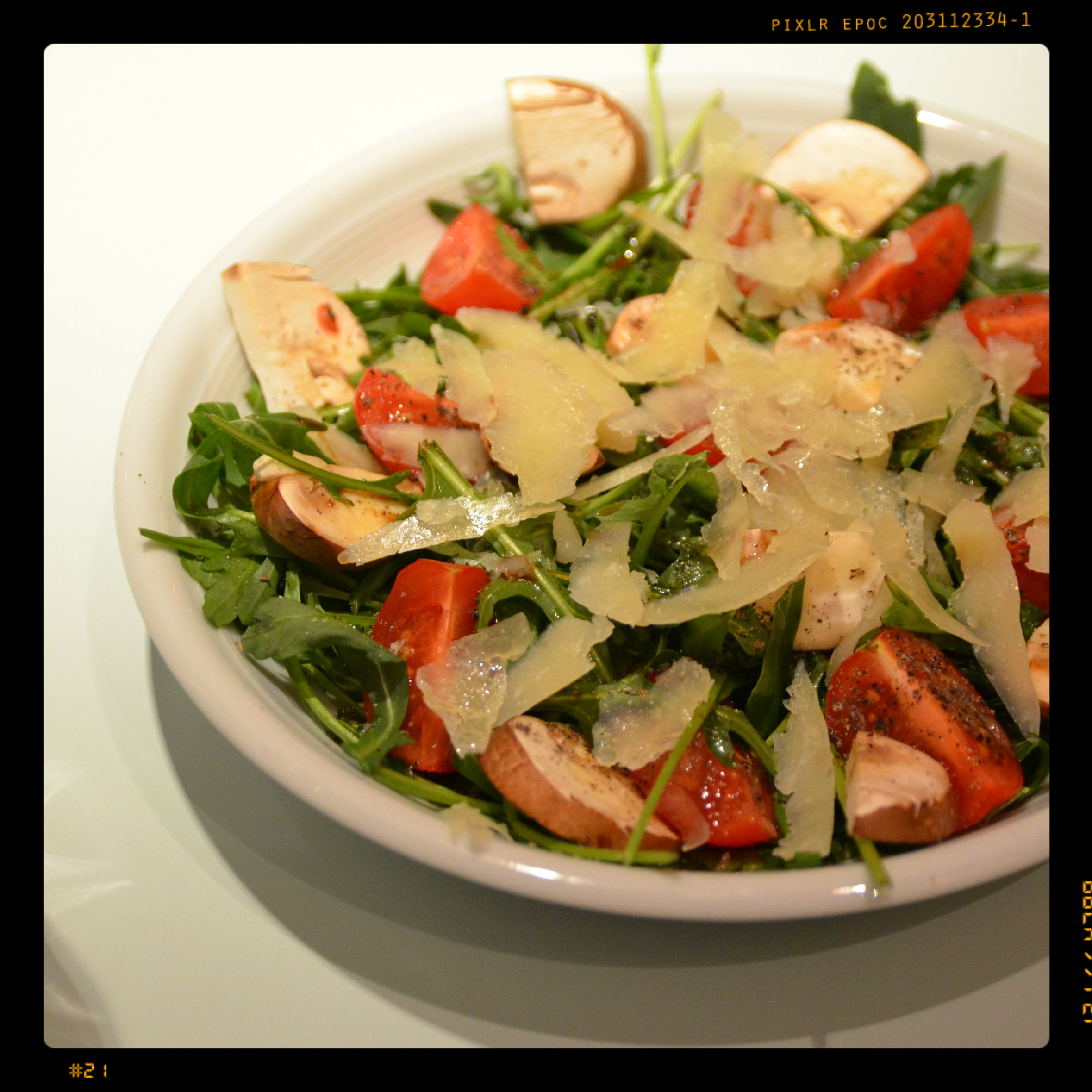 2 braunen Champignons (in Scheiben geschnitten) auf zwei Salattellern verteilen, mit