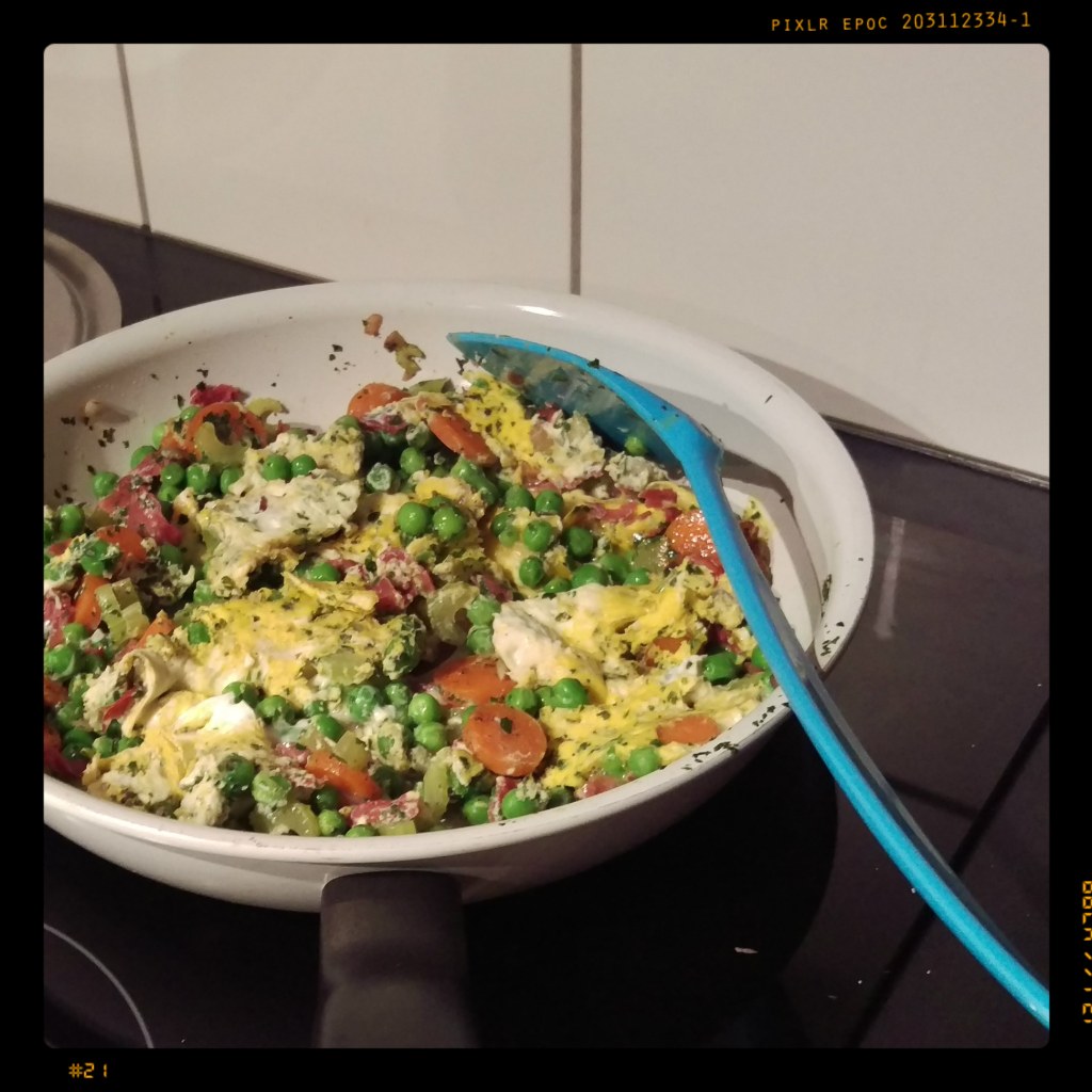 3 Eier (mögl. M) über der Gemüsemischung aufschlagen und unter häufigerem Umwenden stocken lassen, dabei mit