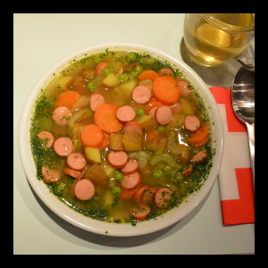 2 Wiener Würstchen (ca. 165 g – natürlich vom Bio-Metzger des Vertrauens) in Scheiben von ca. 5 mm schneiden, hinzufügen und noch 5 – 10 Min. ziehen lassen, den Eintopf mit