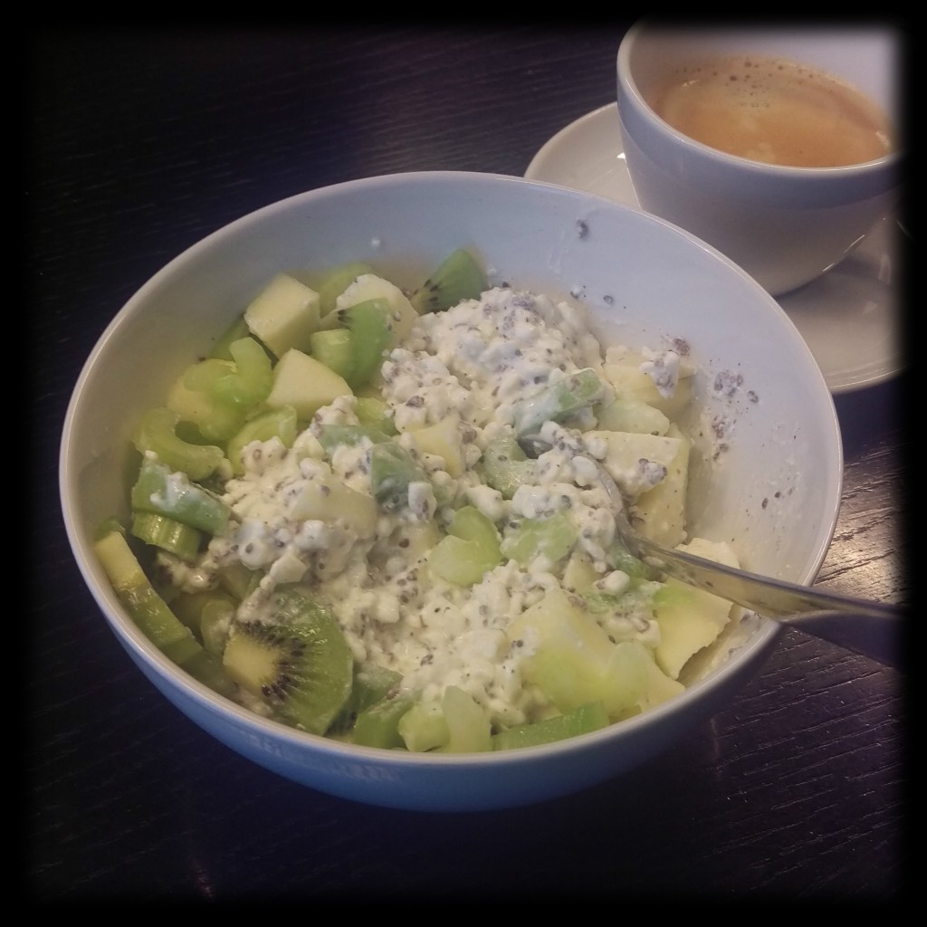 1 kleinen Apfel in kleinere Würfel schneiden, zum Teil mit dem Hüttenkäse mischen und den Rest darübergeben