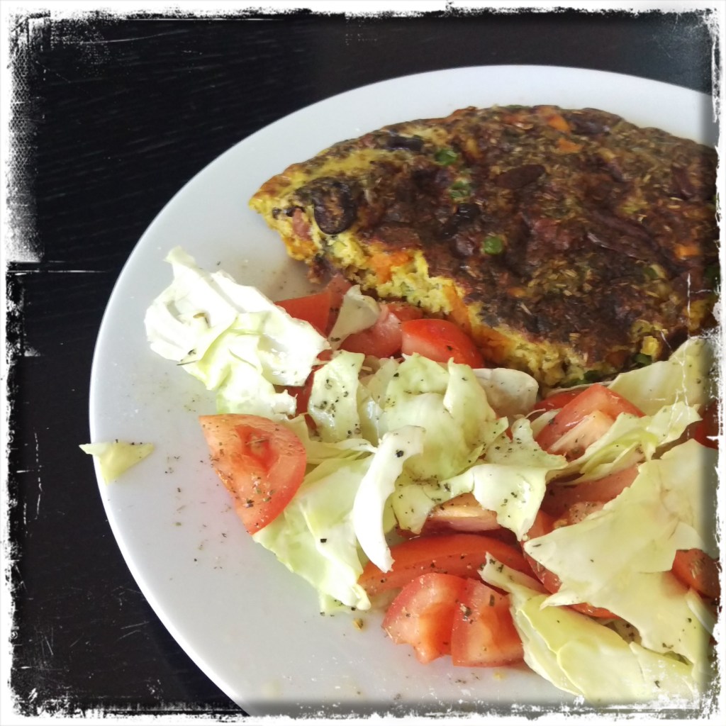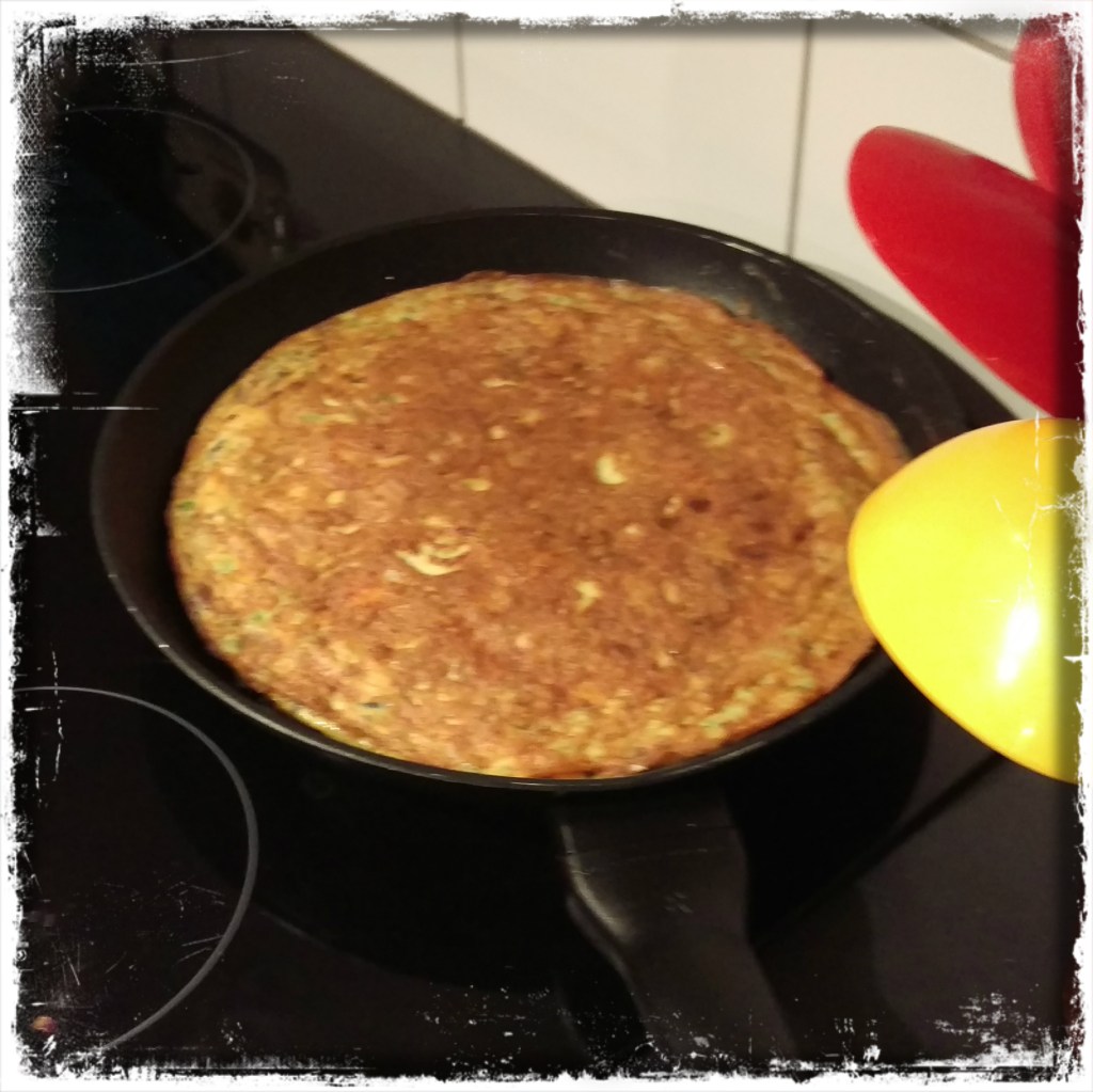 1 EL Kokosöl in der Pfanne mittelstark erhitzen, die Ei-Mischung hineingießen und die Pfanne sofort mit dem Deckel schließen, nach 4 Min. die Hitze auf mittelschwach reduzieren, etwa weitere 10 Min. garen, bis auch die Oberfläche gestockt ist, dann die Tortilla mit