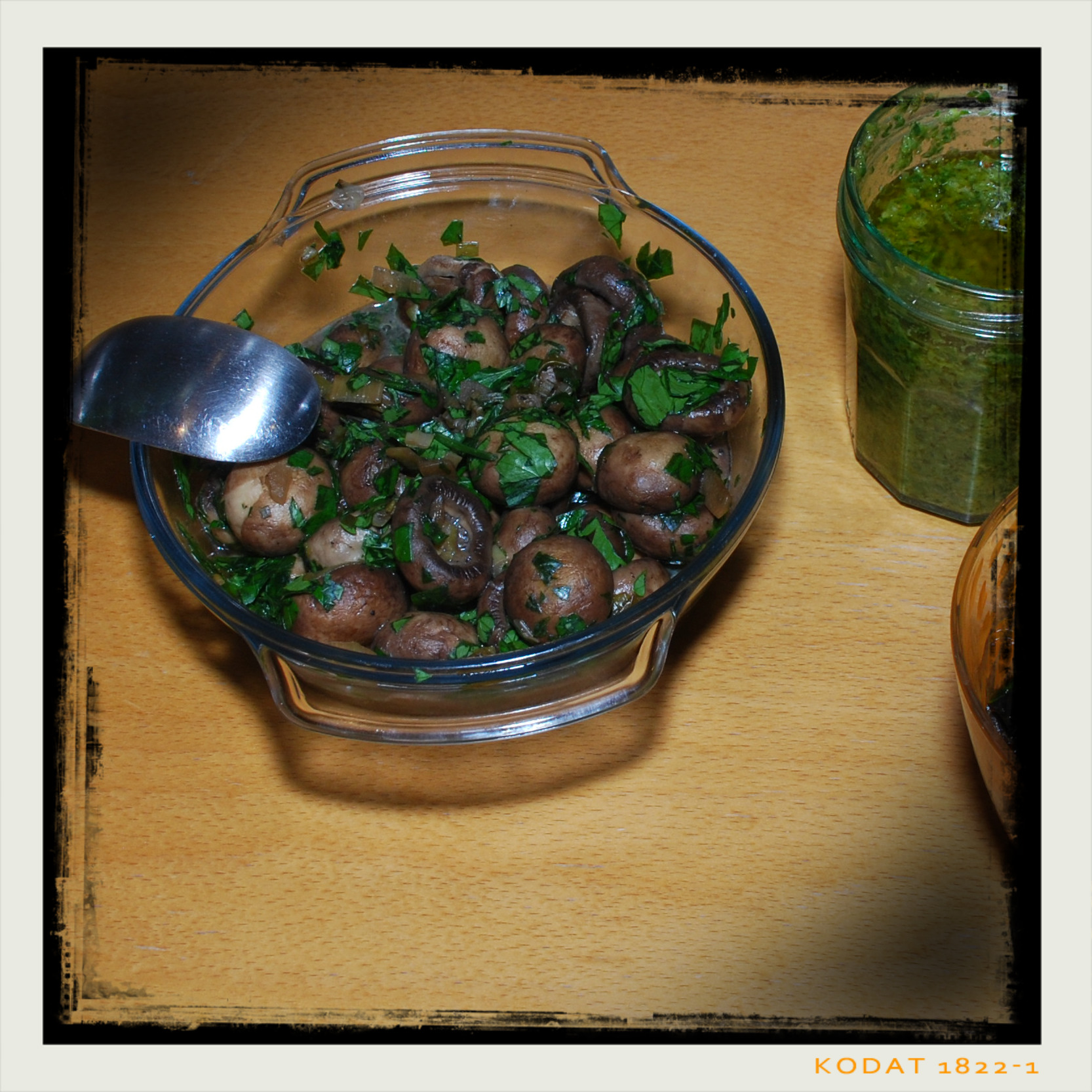 500 g kleine Steinchampignons (ersatzweise kleine braune Champignons), Knoblauch und Frühlingszwiebeln hinzugeben und unter ständigen Rühren ca. 5 Min. braten, bis die Flüssigkeit aus den Champignons annähernd verdampft ist, dann mit