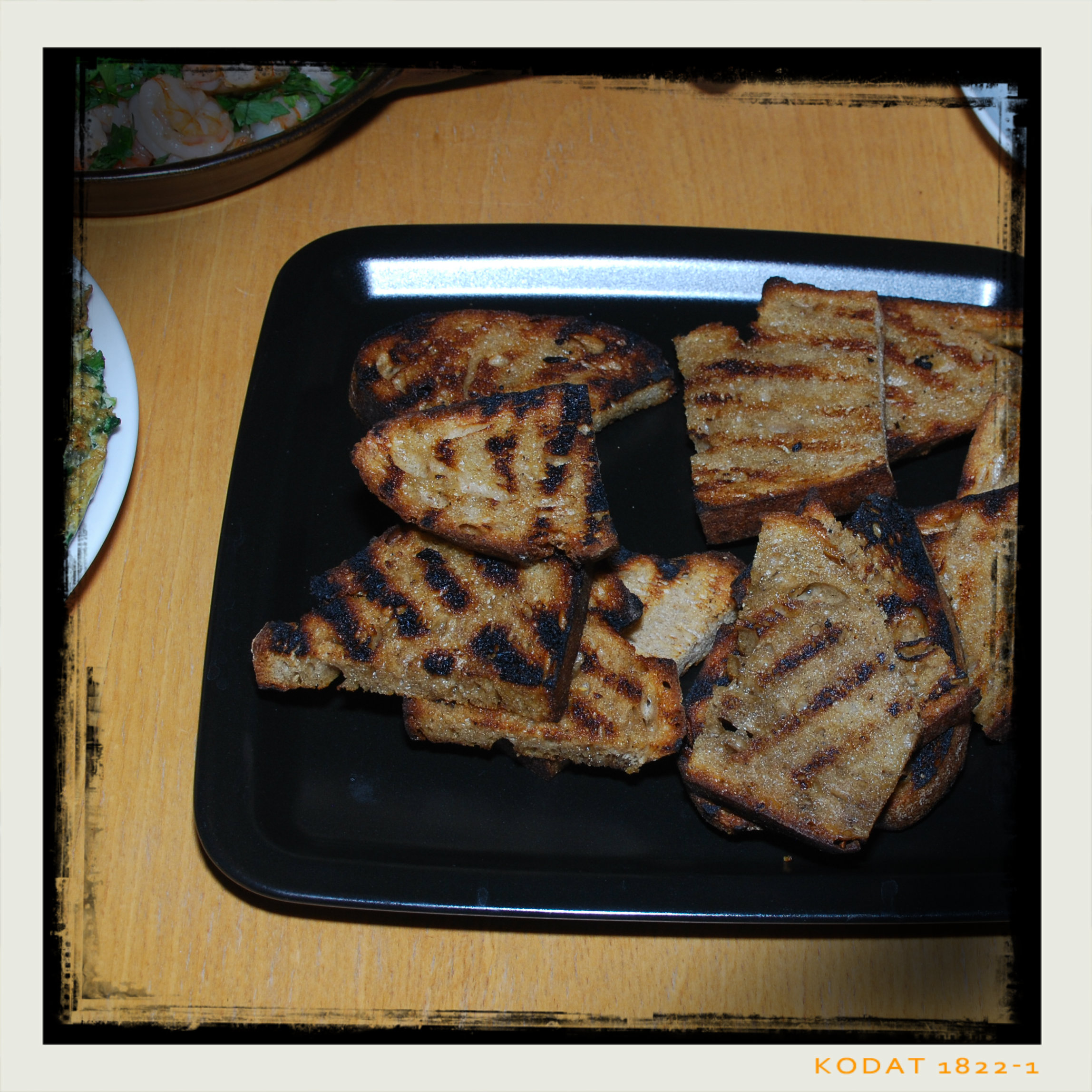 1/2 frischen Krustenbrot (ca. 375 g) abschneiden, halbieren und von beiden Seiten mit der Knoblauchbutter einstreichen, dann bis zu einer schönen Bräunung von beiden Seiten grillen oder braten