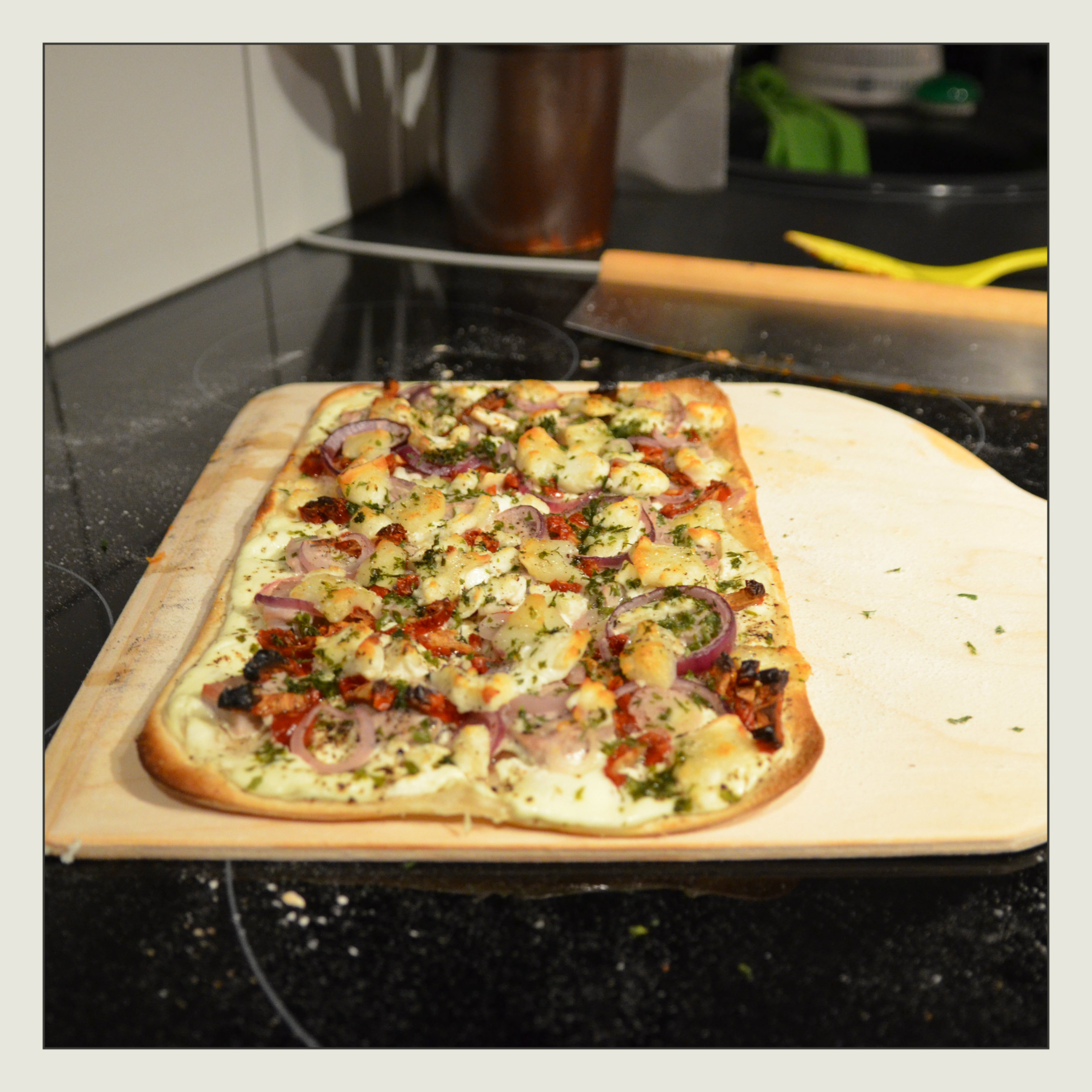 den Flammkuchen auf den Stein gleiten lassen und ca. 7 – 8 Min. backen (alternativ auf Backpapier ca. 12 Min.)