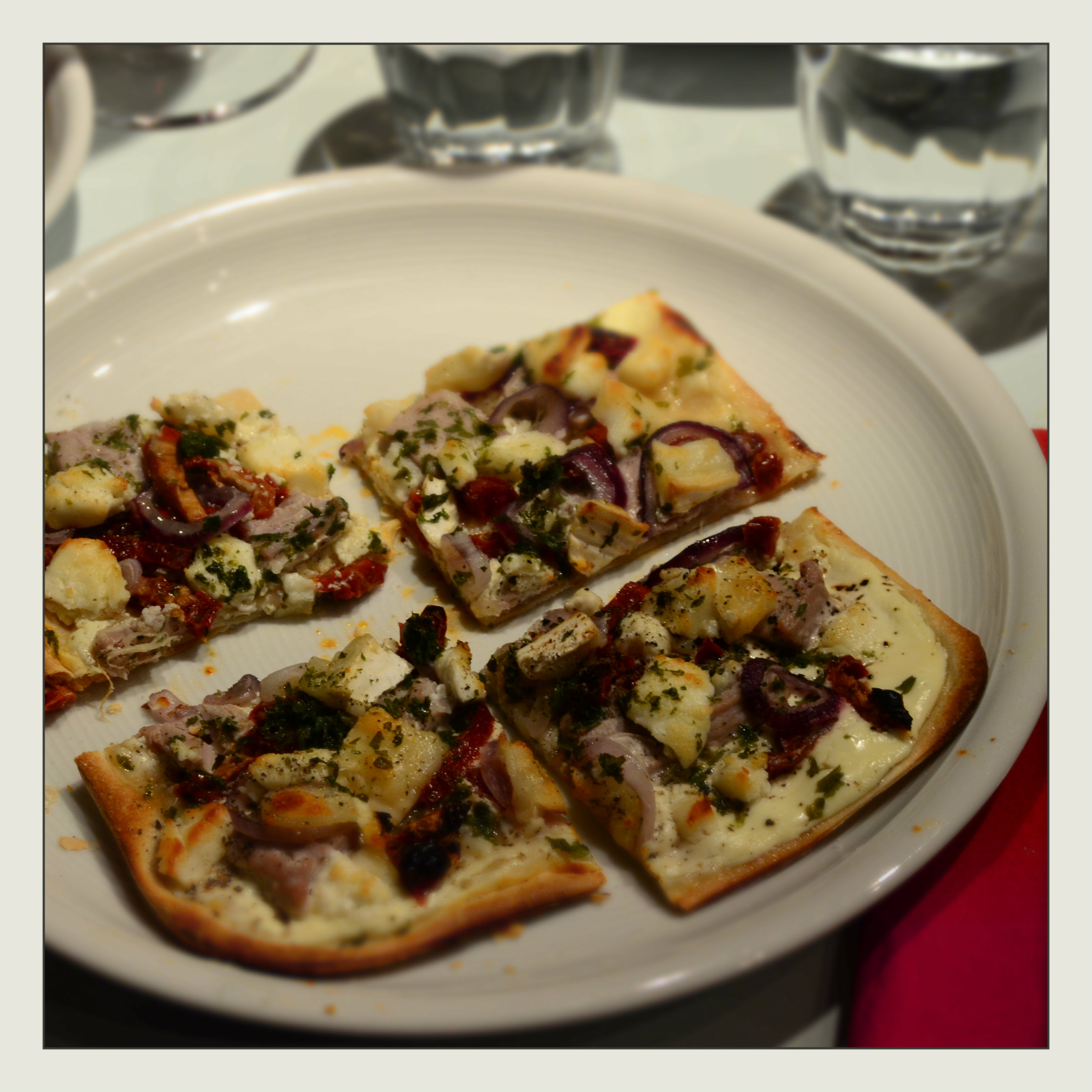 1 Fertig-Flammkuchenteigplatte (85 g, z. B. Tante Fanny) auf einem