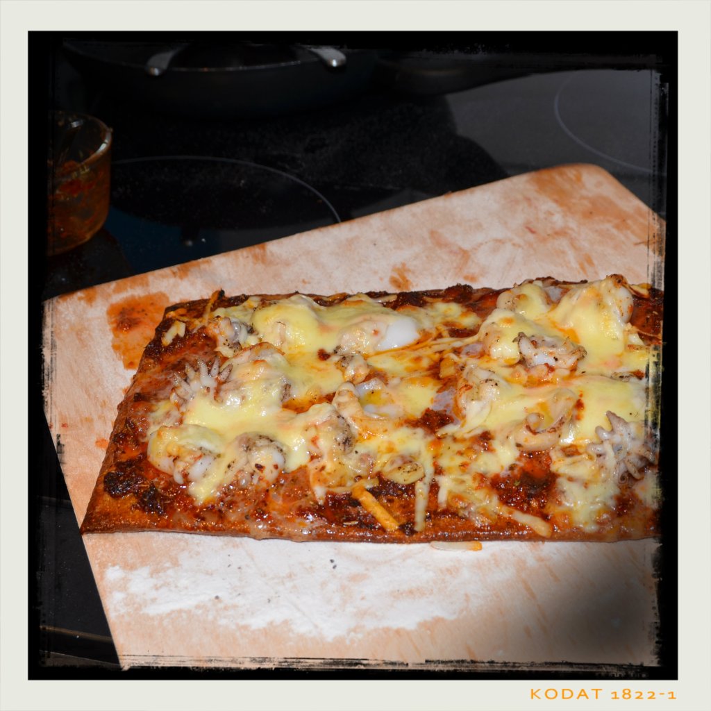 die vorgebackene Lizza umdrehen und mit der Tomatensauce bestreichen, anschließend die Chipirones und Zwiebelringe darauf verteilen, mit