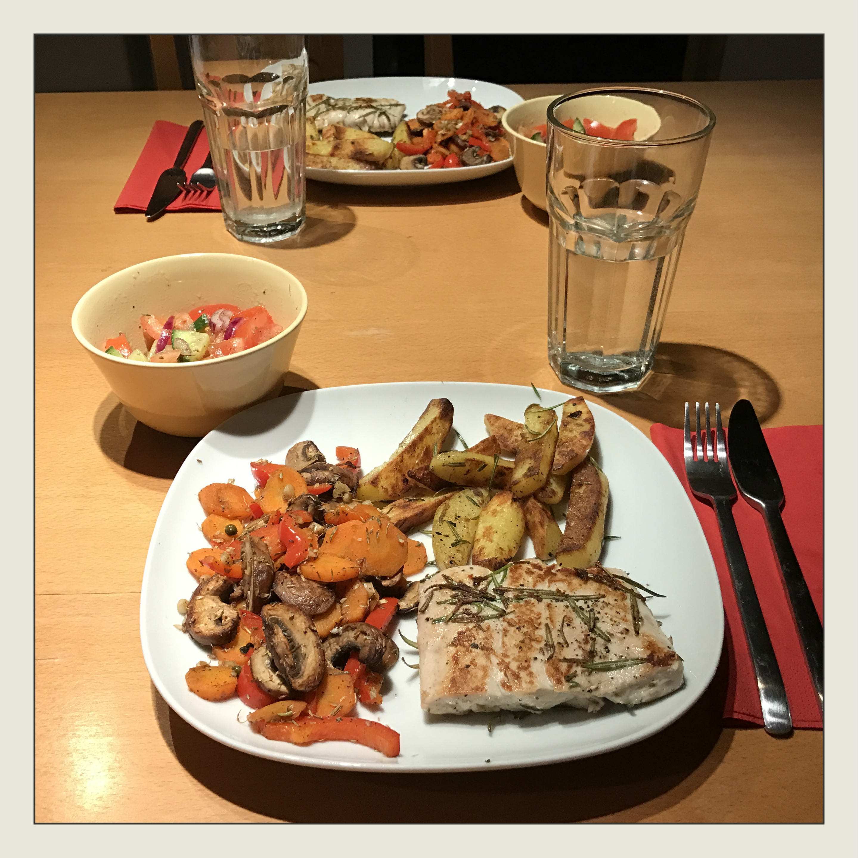 frisch gemahlenem schwarzen Pfeffer würzen und zusammen mit dem Gemüse und den Röstkartoffeln auf vorgewärmten Tellern servieren