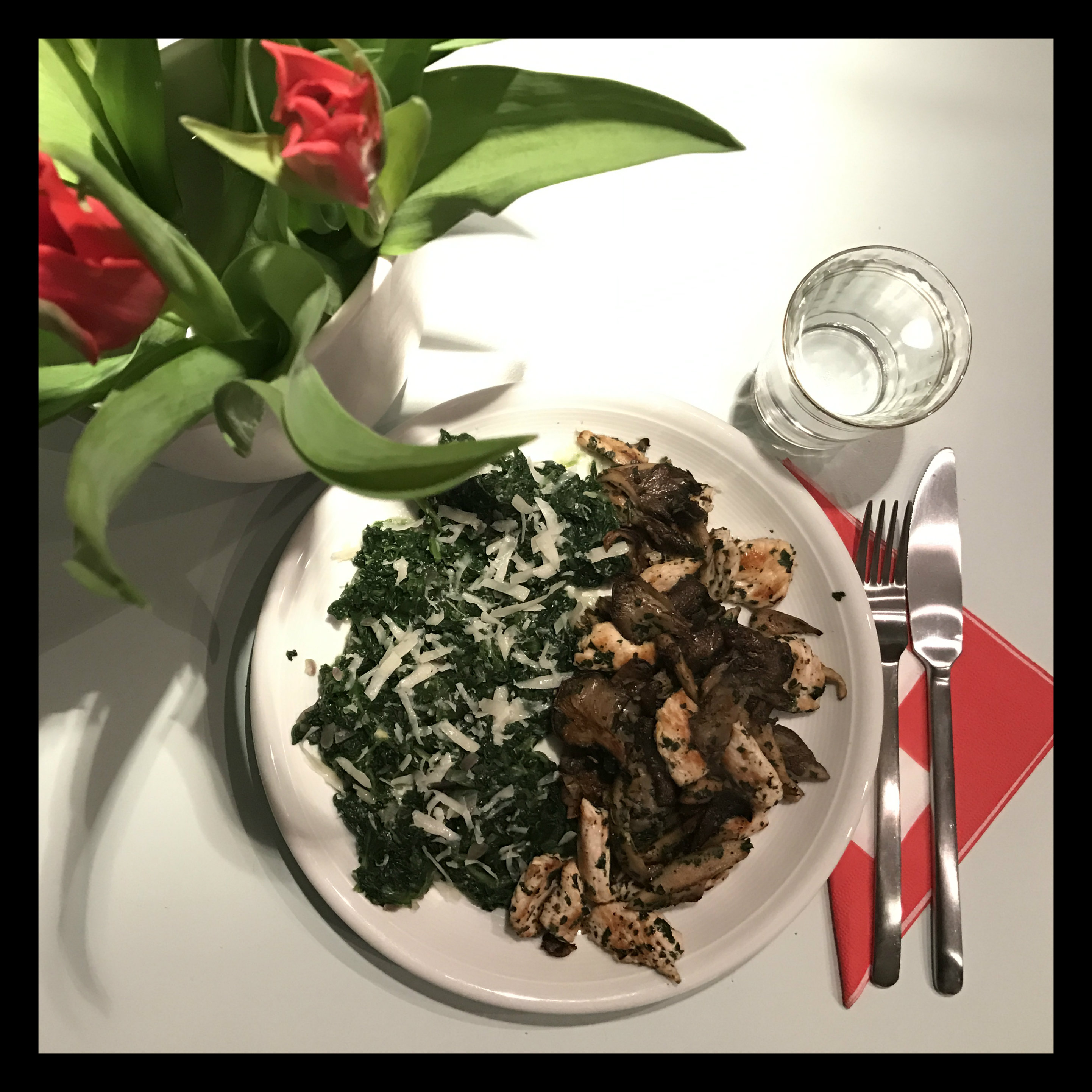 den Spinat und die Pilzmischung auf einen großen vorgewärmten Teller geben, den Spinat mit dem Pecorino bestreuen