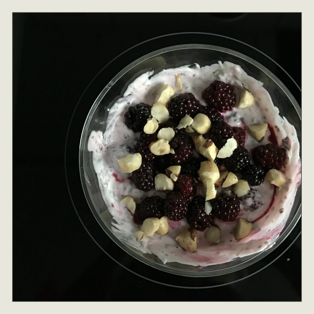 1 EL Kakaobits unterrühren, die Brombeeren auf den Joghurt geben und mit