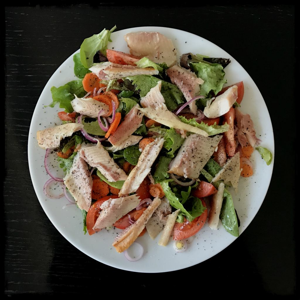 frisch gemahlenem schwarzen Pfeffer zubereiten und die Forellenfilets in Stücken darauf verteilen