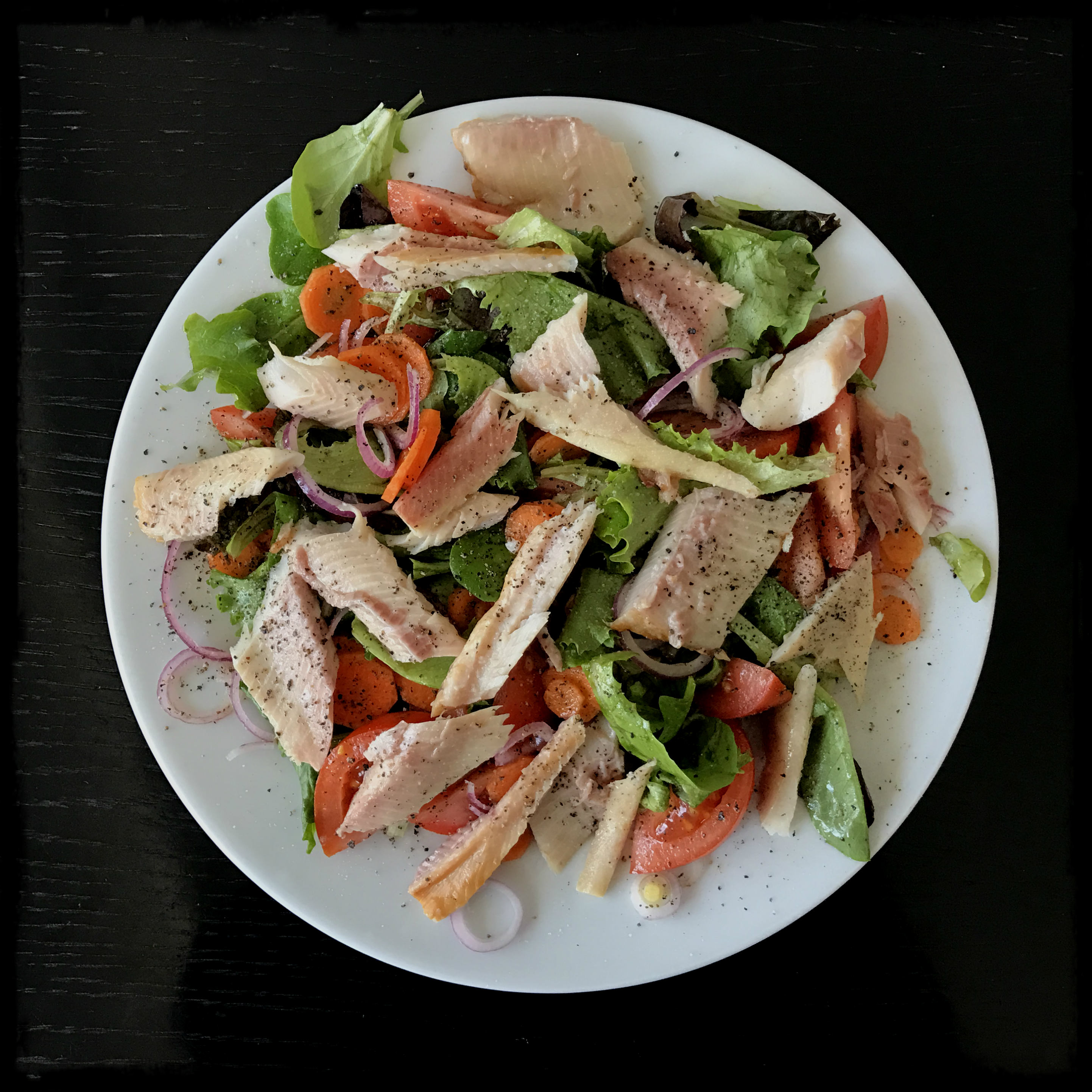 125 g geräuchertes Forellenfilet in der Mikrowelle leicht erwärmen oder zumindest aus dem Kühlschrank nehmen und auf Raumtemperatur bringen