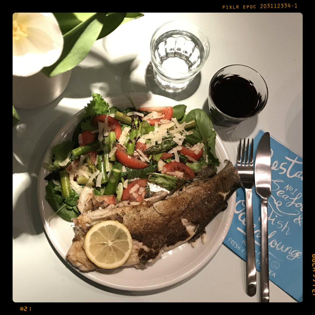 frisch gemahlenem schwarzen Pfeffer einen Salat mischen und auf der einen Hälfte eines großen Tellers anrichten