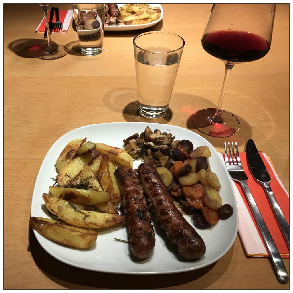 die Rostbratwürste mit den Röstkartoffeln, den Möhren und Champignons auf zwei vorgewärmte Teller geben