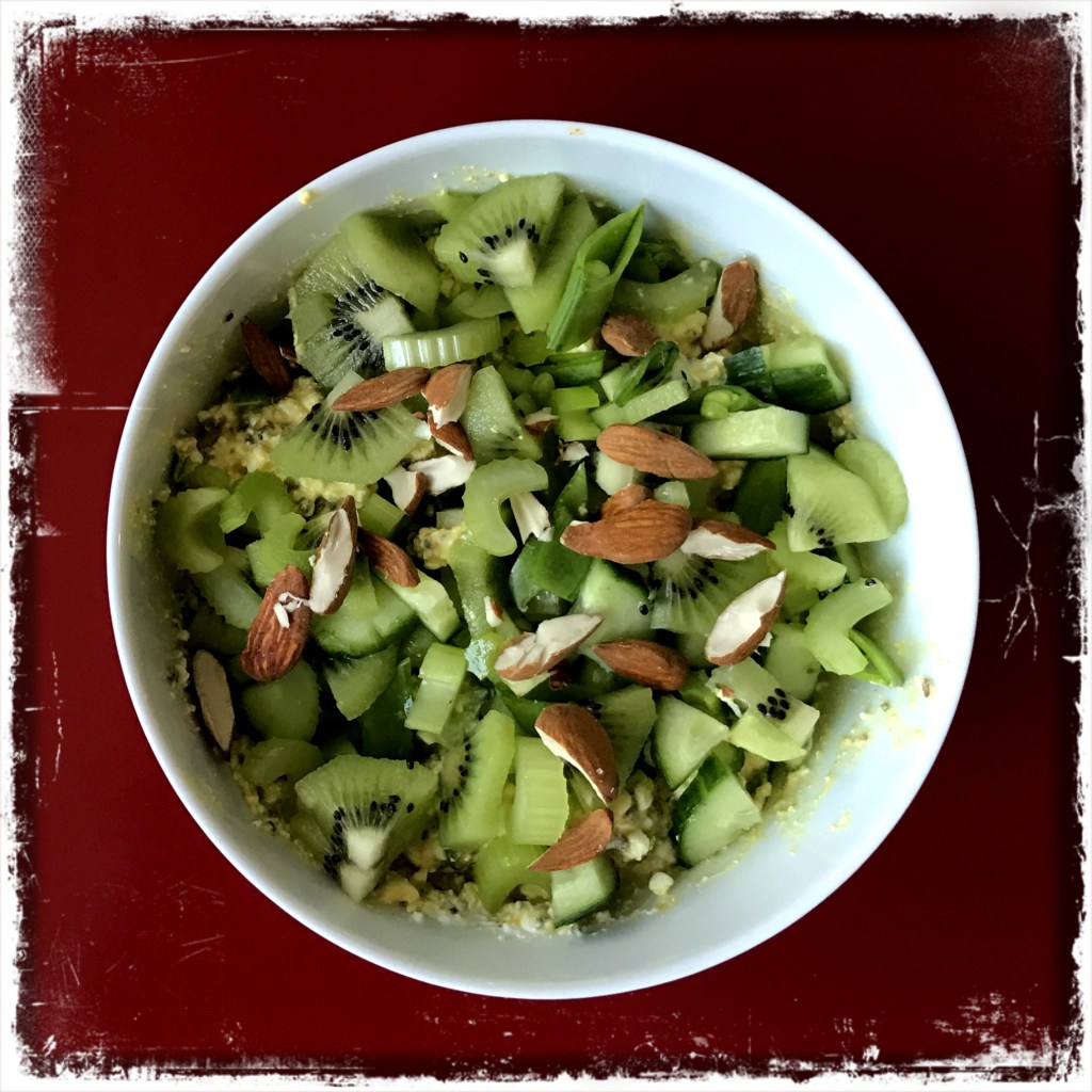 1 Kiwi längs vierteln und in Scheiben schneiden, alles zum Teil unter den Hüttenkäse mischen und den Rest darauf verteilen, zum Schluss mit