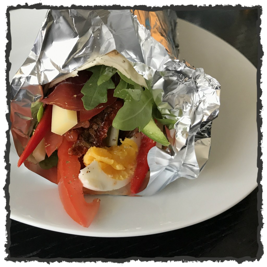 frisch gemahlenem schwarzen Pfeffer würzen, zu einem Wrap fest zusammenrollen und in