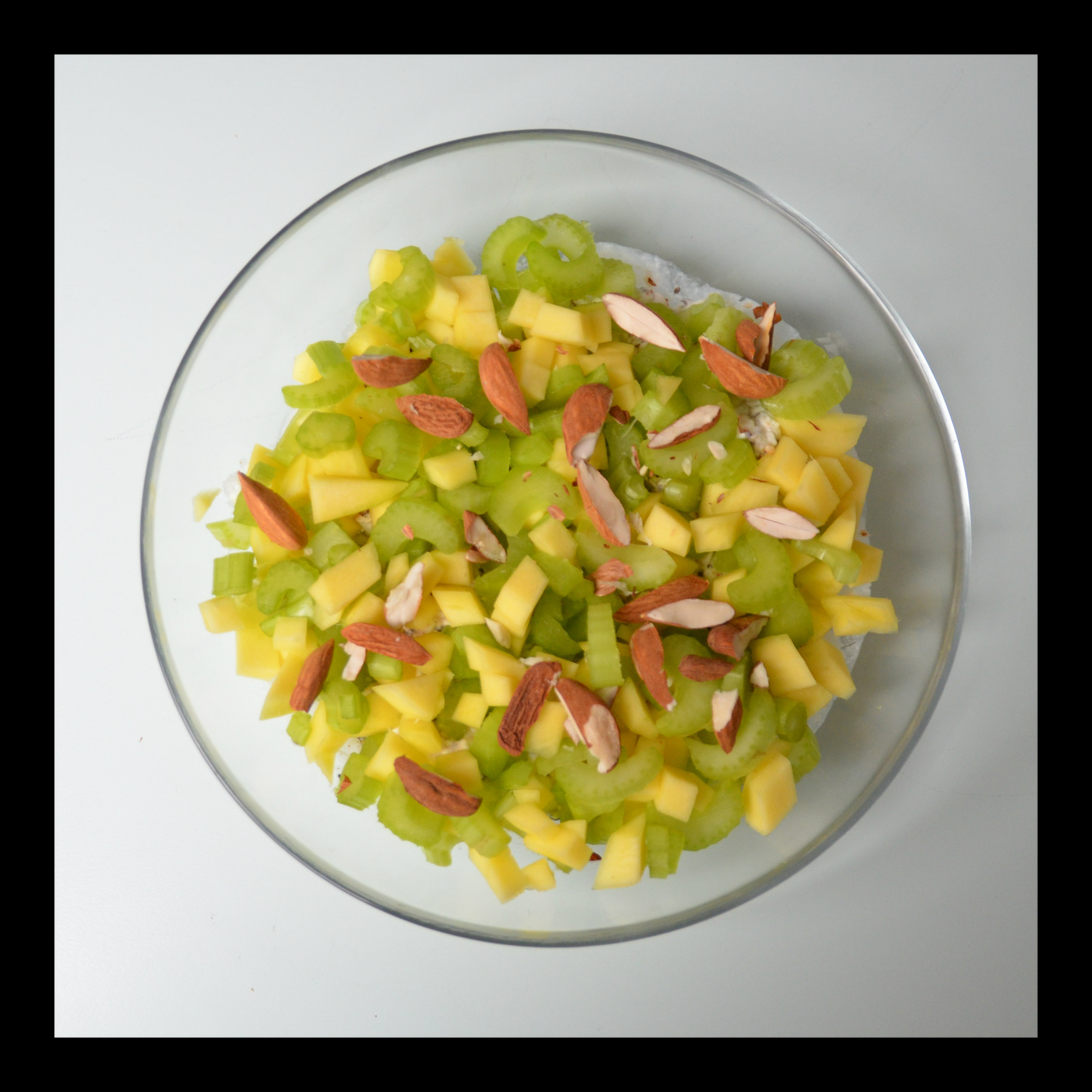 2 Stangen Staudensellerie in dünne Scheiben schneiden, beides auf den Hüttenkäse geben und mit
