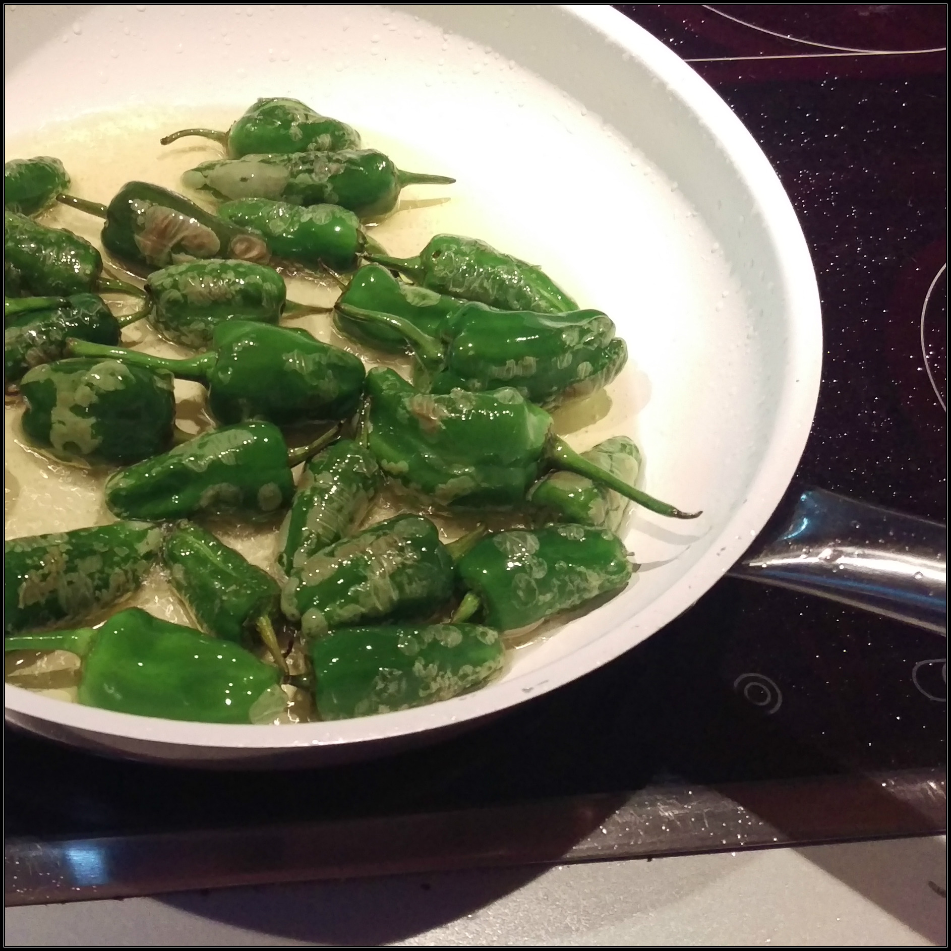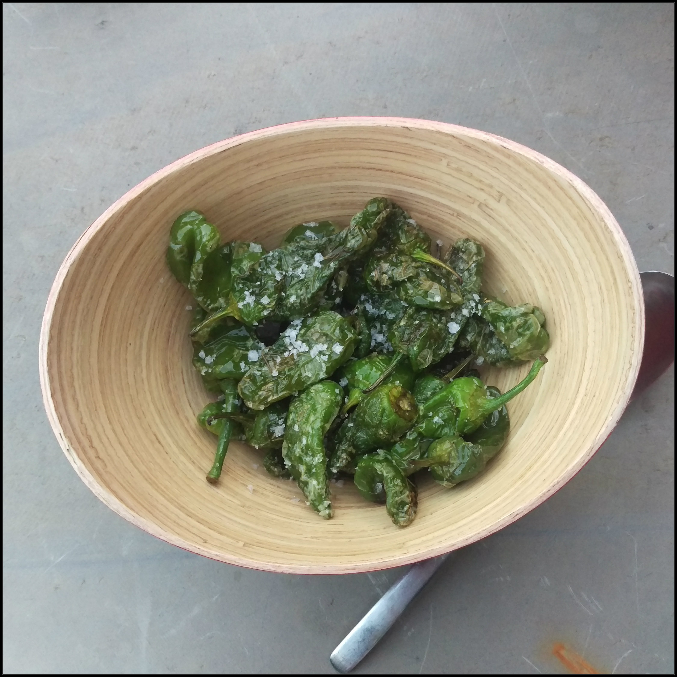 200 g kleine grüne Brat-Paprika hinzugeben und unter ständigem Wenden 1 – 2 Min. braten, bis die Haut Blasen wirft, dann aus der Pfanne nehmen, auf