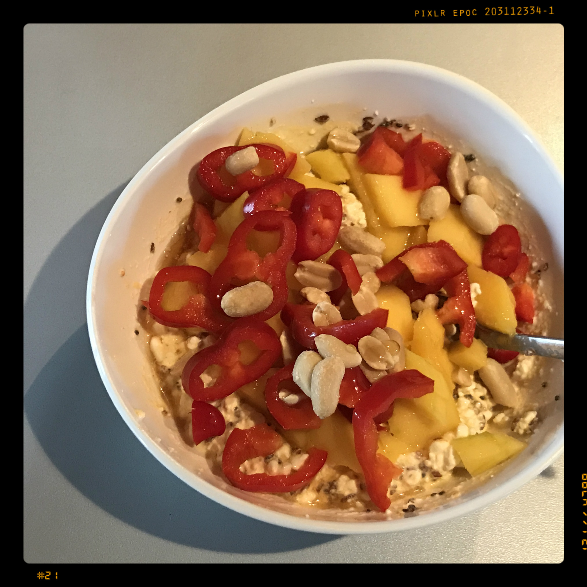 1/4 rote Spitzpaprika (in dünne Ringe geschnitten) darübergeben, mit
