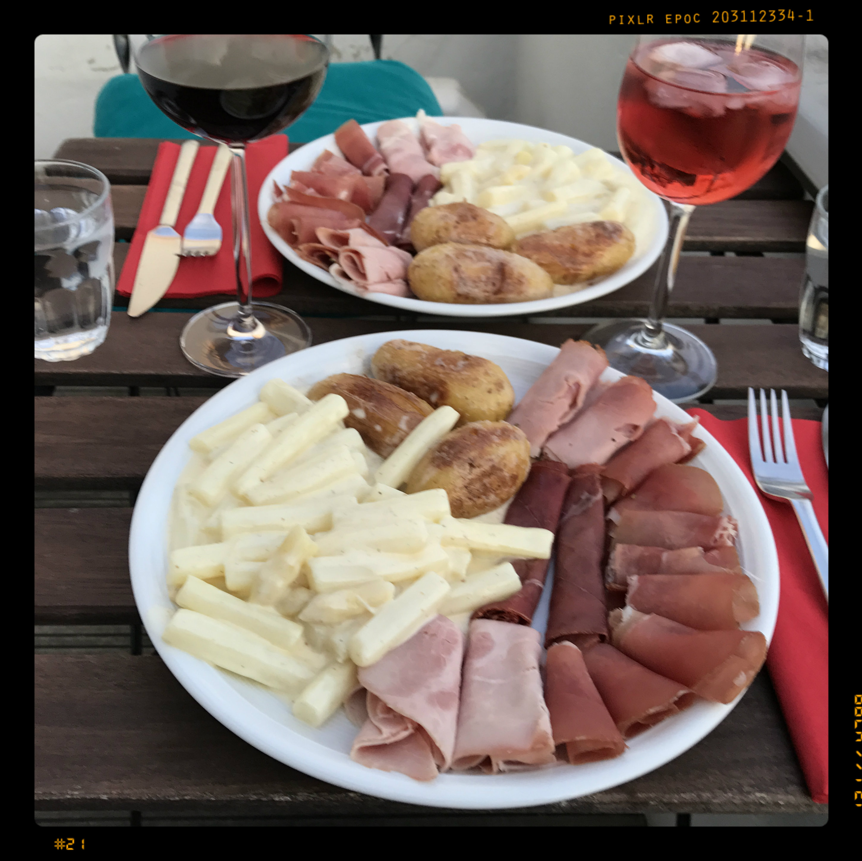 240 g Schinken, gemischt (z. B. gekochter Schinken, Farmer-Schinken, luftgetrockneter Schinken, Schwarzwälder Schinken, Rinderrauchfleisch) in Scheiben geschnitten und gerollt auf zwei Esstellern verteilen, dabei Platz für Kartoffeln und Spargel lassen
