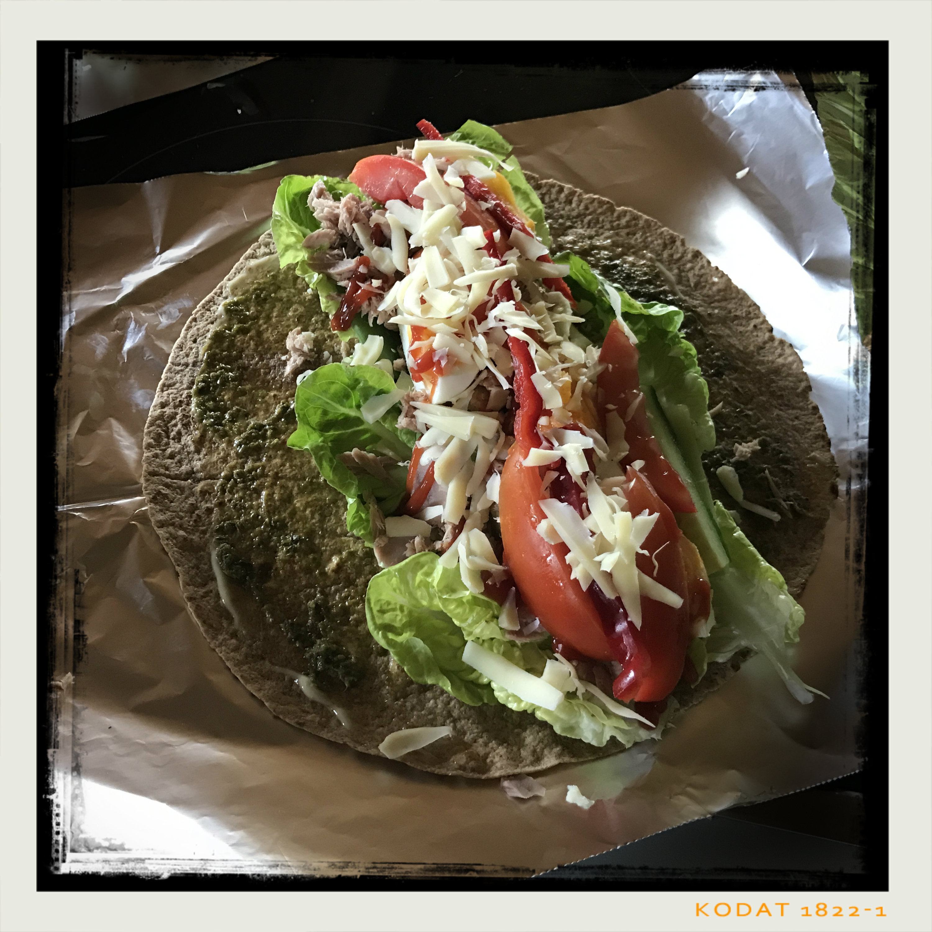 ca. 20 g Emmentaler (grob gerieben) bestreuen, zu einem Wrap fest zusammenrollen und in