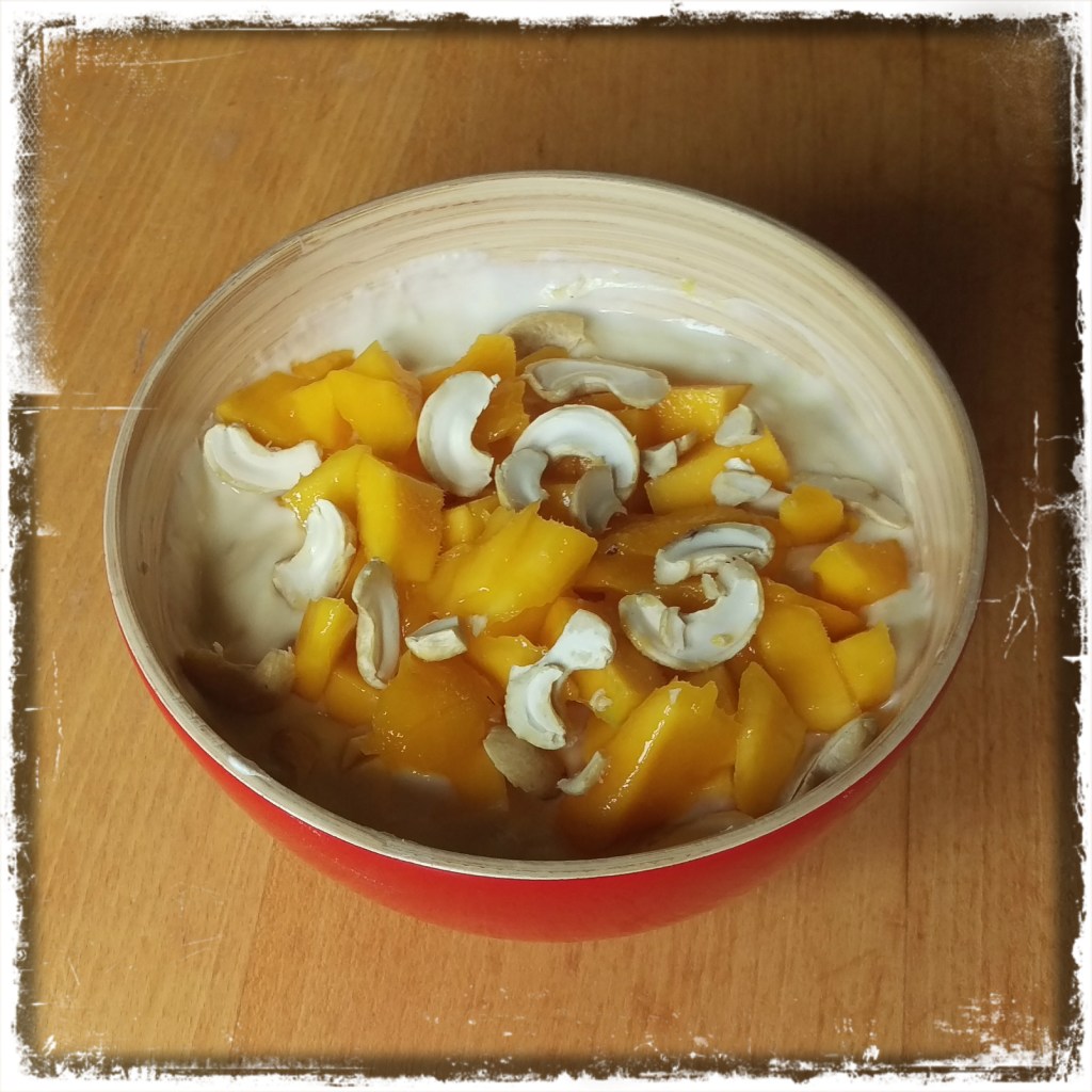 1/2 kleinere Mango in Stücke schneiden und auf den Joghurt geben, dann mit