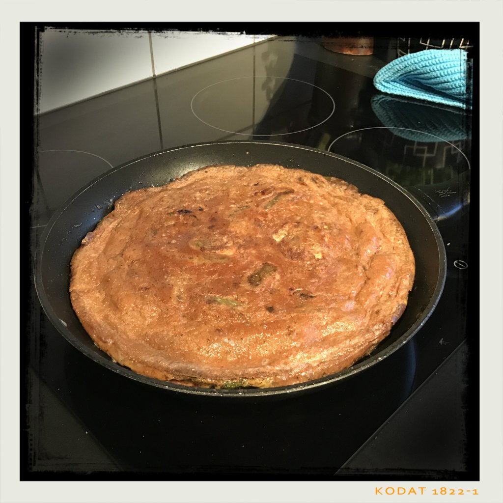 1 EL Brat-Olivenöl geben, die Pfanne sofort mit dem Deckel schließen und nach ca. 3 Minuten auf mittelschwache Hitze herunterschalten, etwa 10 – 15 Minuten garen, bis auch die Oberfläche der Tortilla gestockt ist, die Tortilla über den Deckel wenden die andere Seite etwa 3 Minuten bei mittelstarker Hitze braten, bis sie leicht gebräunt ist