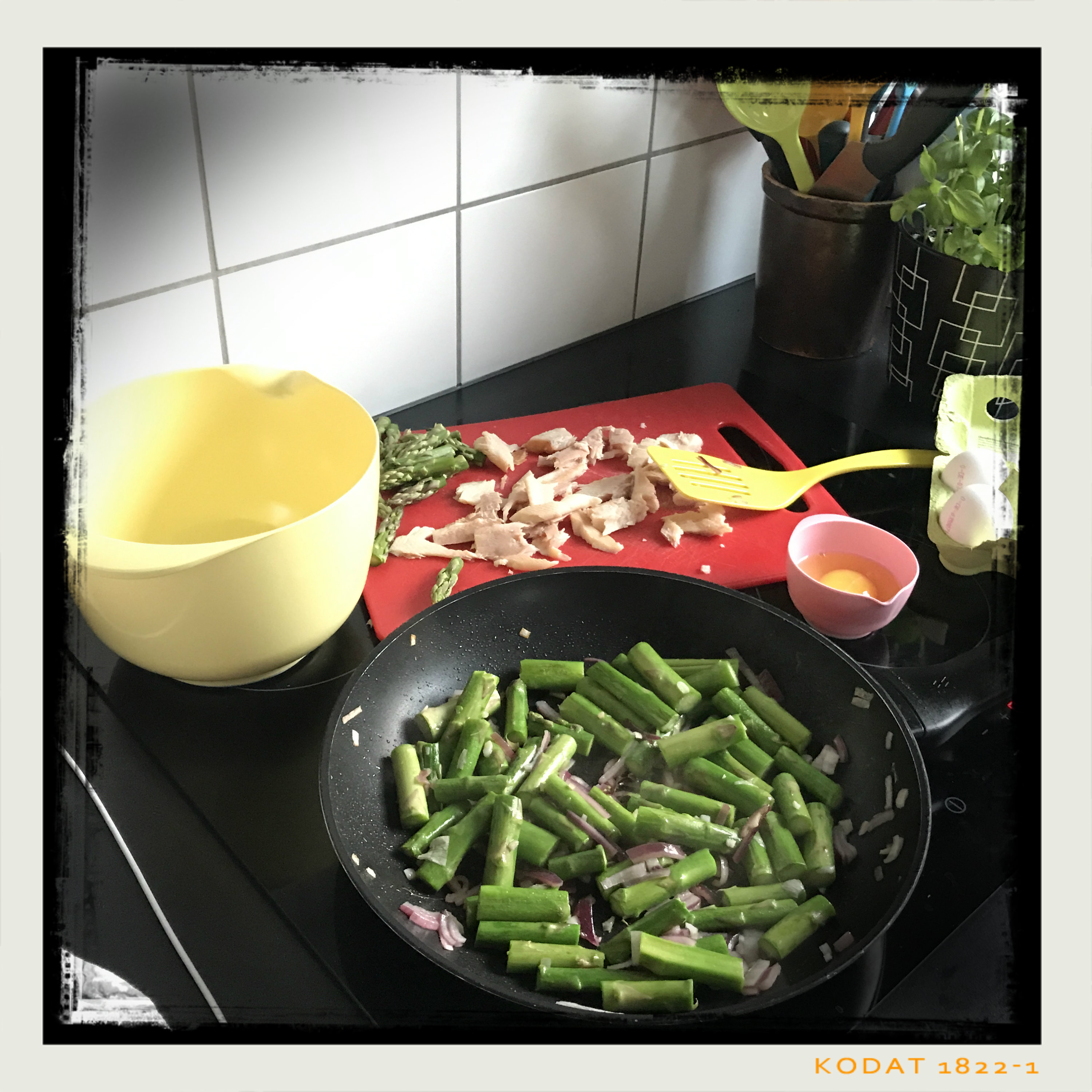 2 EL Brat-Olivenöl ca. 5 Min. braten, dann Spargelköpfe, Zwiebel und Knoblauch hinzugeben und weitere 5 Min. braten,