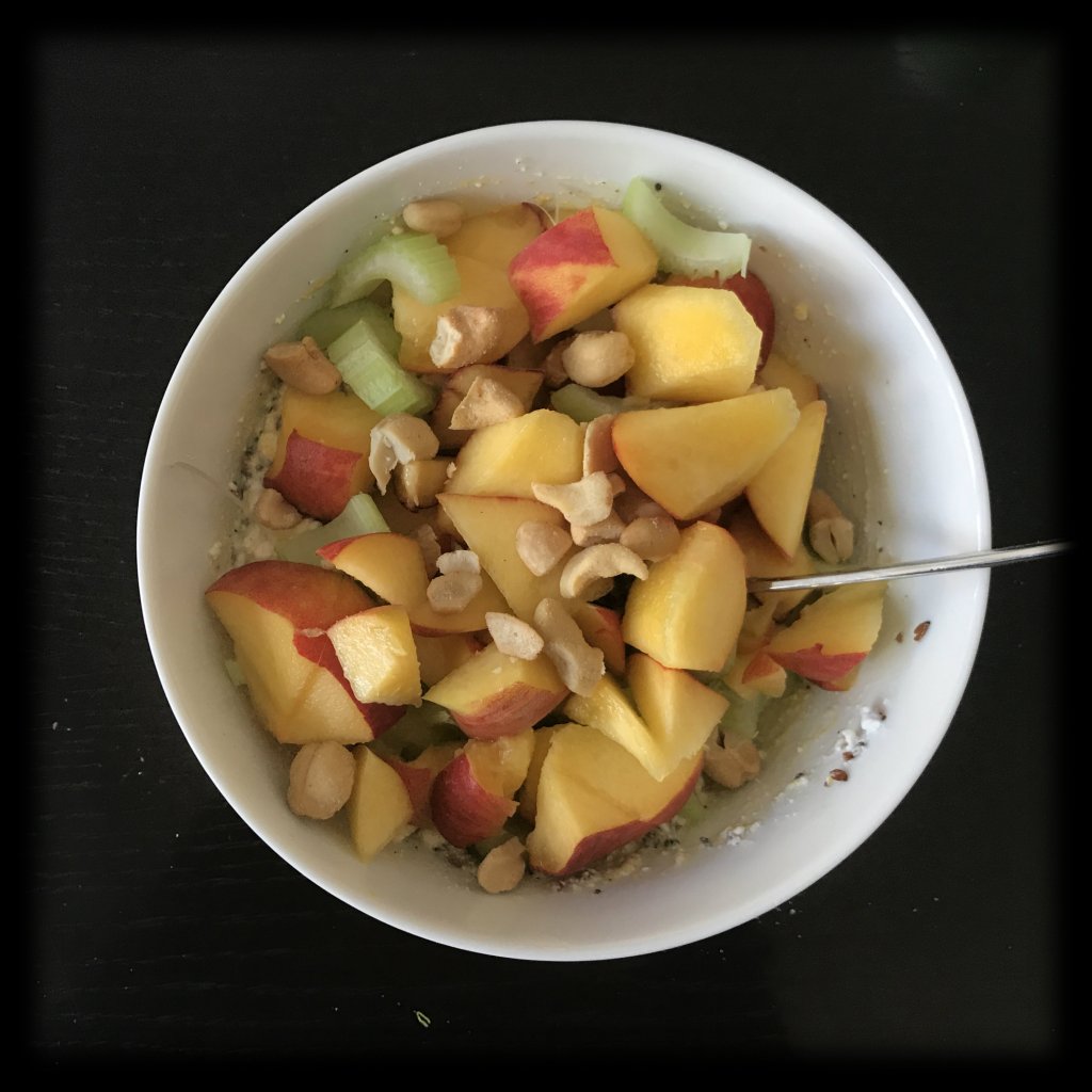 2 kleine Pfirsiche in kleine Stücke schneiden und zusammen mit