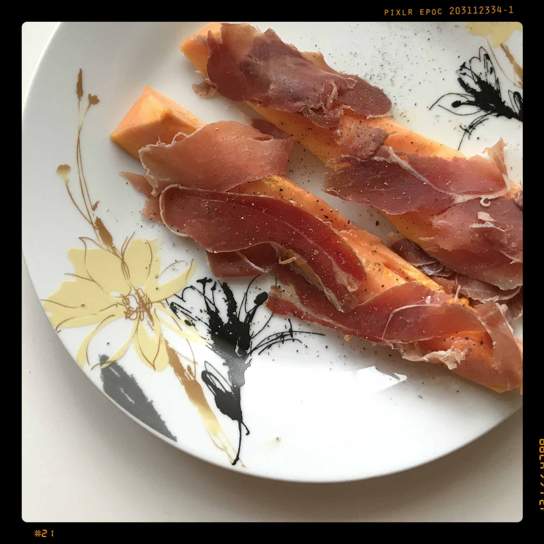 4 Scheiben Serrano-Schinken (ca. 30 g) auf einem Teller anrichten und mit