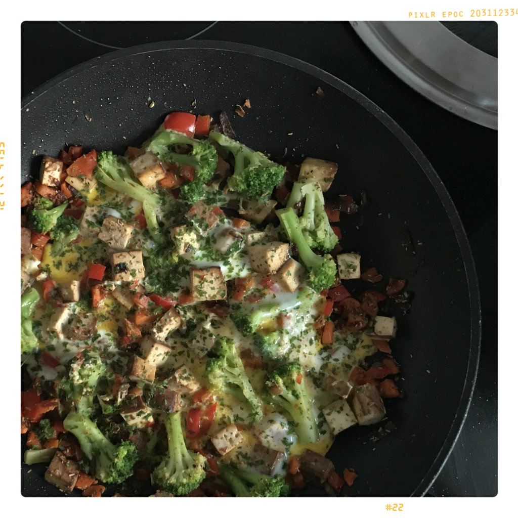 1 geh. EL getr. Oregano in die Pfanne geben und bei mittlerer Hitze 5 Min. dünsten, die Temperatur auf mittelstark erhöhen, den Brokkoli und Tofu hinzufügen, mit