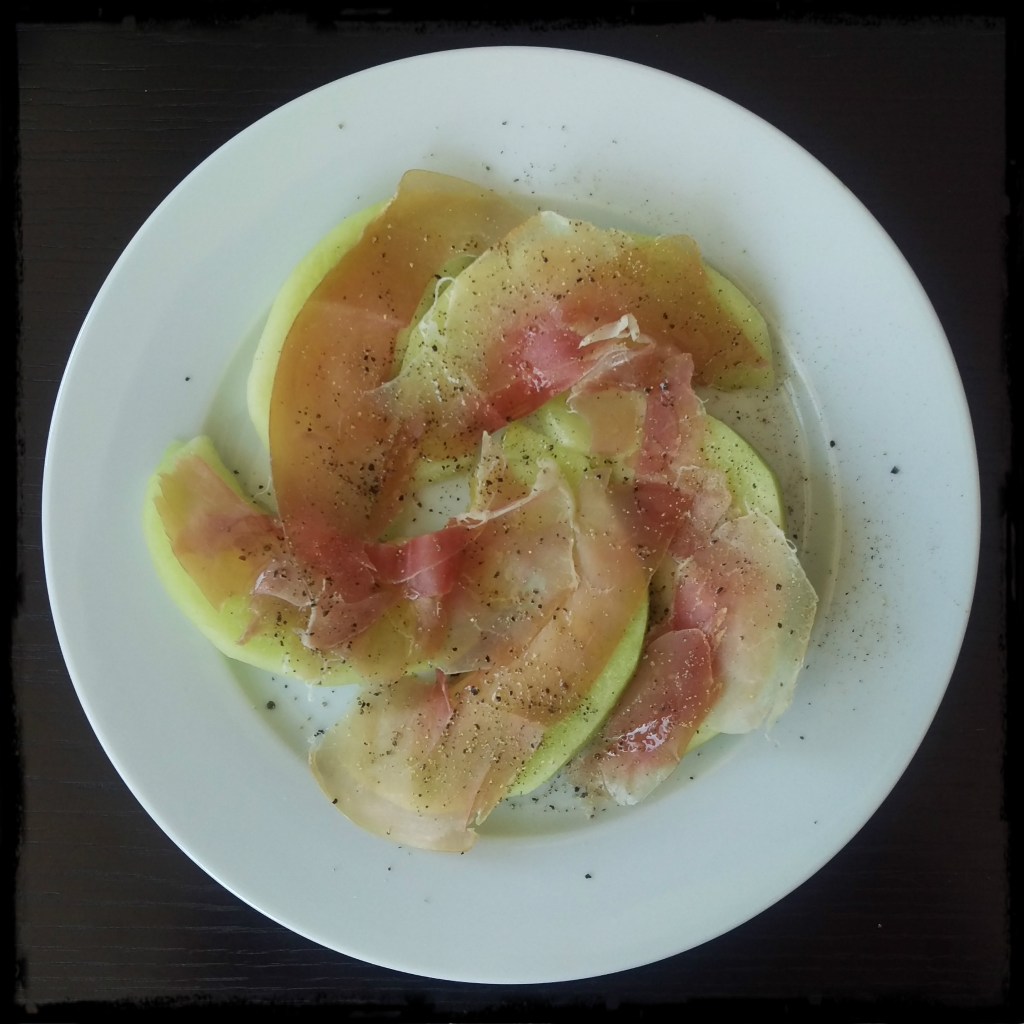 1/4 Galia-Melone in fünf Spelten schneiden, mit