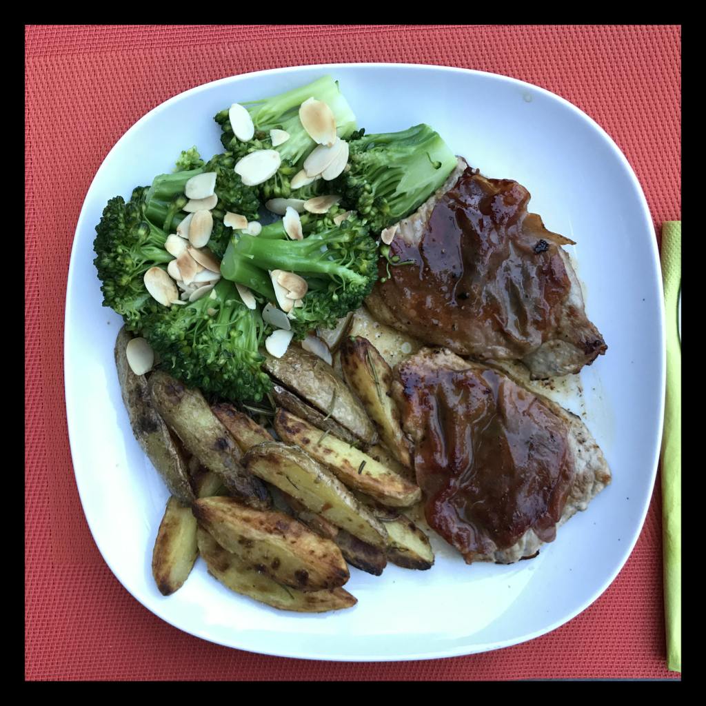 Brokkoli, Kartoffeln und Schnitzel auf zwei vorgewärmten Tellern anrichten, die Mandelblättchen auf dem Brokkoli und die Sauce auf den Schnitzeln verteilen