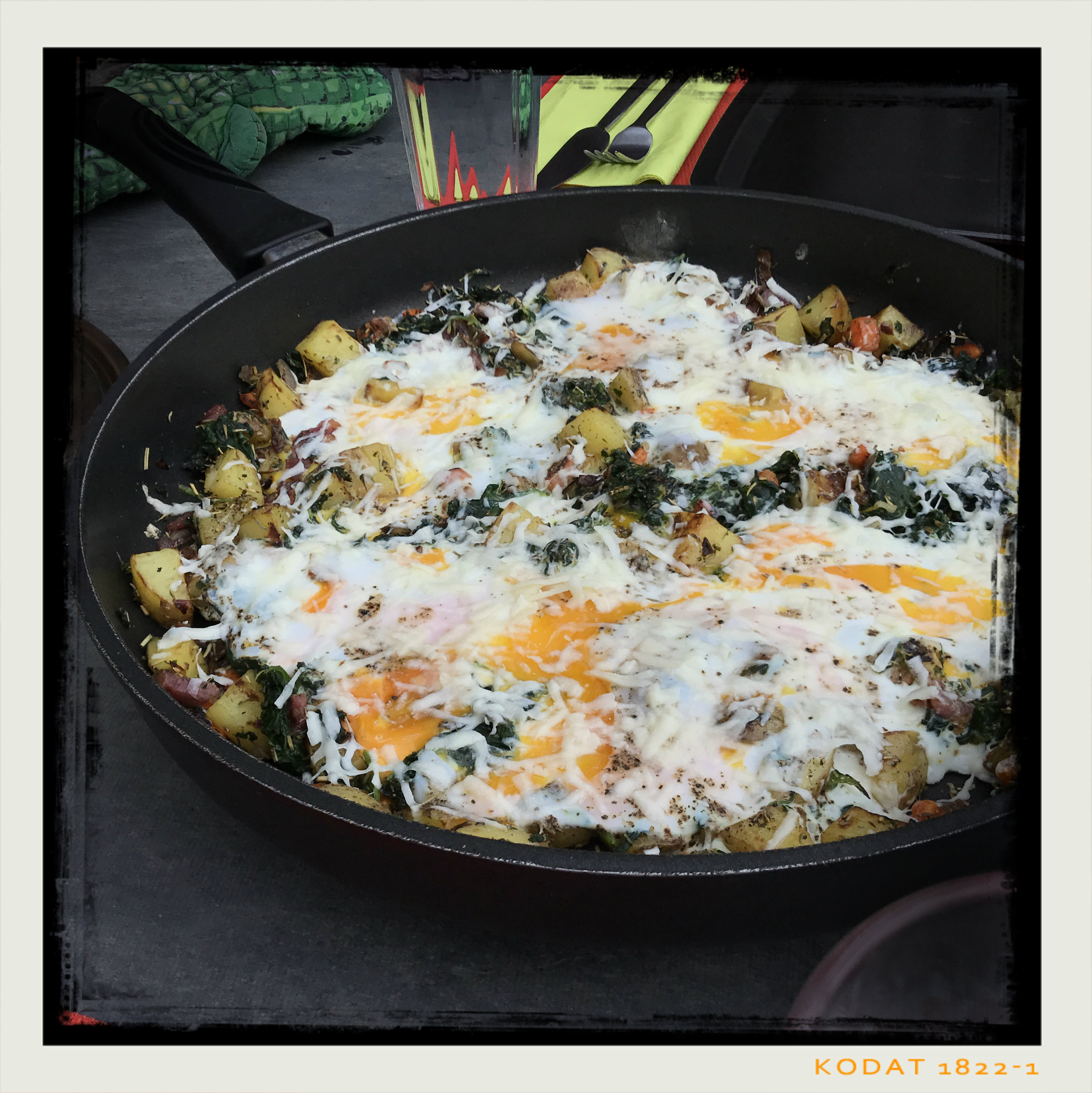 6 Eier (mögl. M) aus größerer Höhe auf das Gemüse klatschen lassen, die Pfanne mit dem Deckel schließen und die Eier in ca. 3 Min. stocken lassen, dann noch etwas