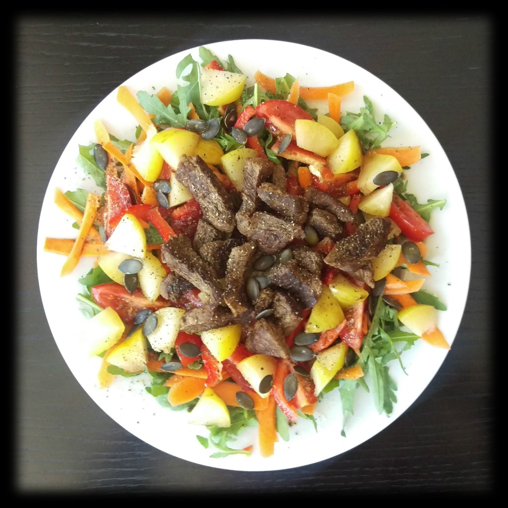150 g argentinisches Hüftsteak in kurze dickere Streifen schneiden und kurz scharf anbraten, dass sich die Poren schließen