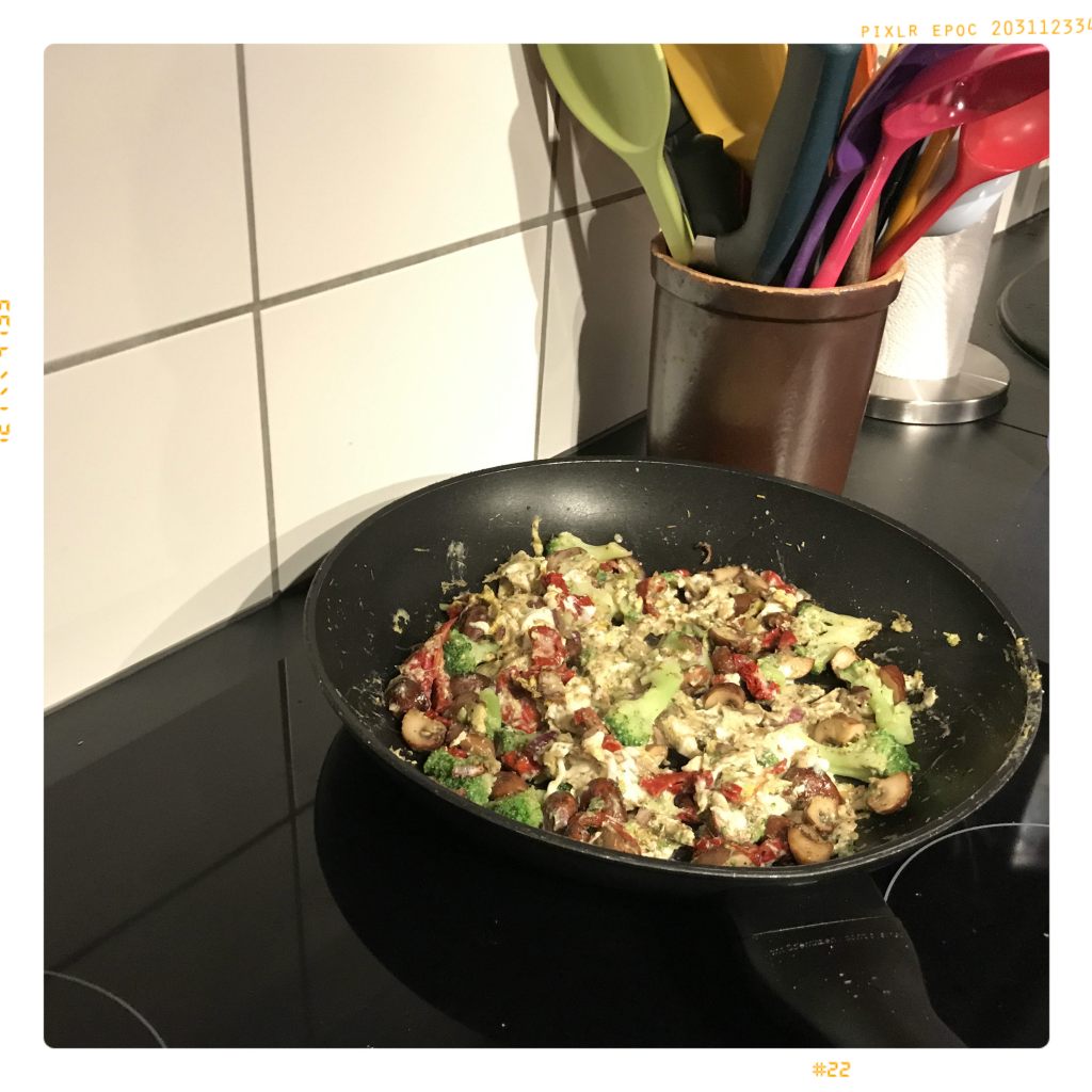 3 Eier (M) hinzufügen, alles unter häufigen Umwenden bei mittlerer Hitze weiterbraten, bis das Ei gestockt ist