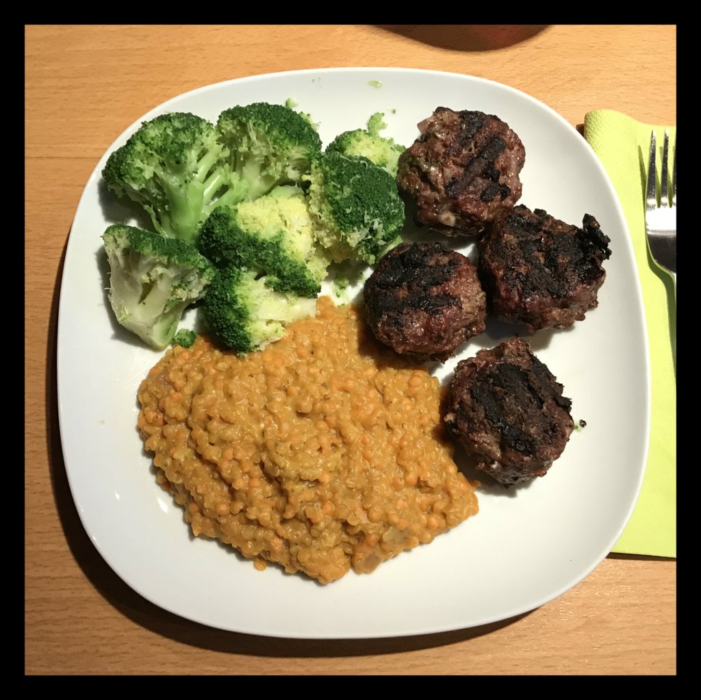 das Dahl auf zwei vorgewärmte Teller geben und mit dem Brokkoli und den Hackbällchen servieren