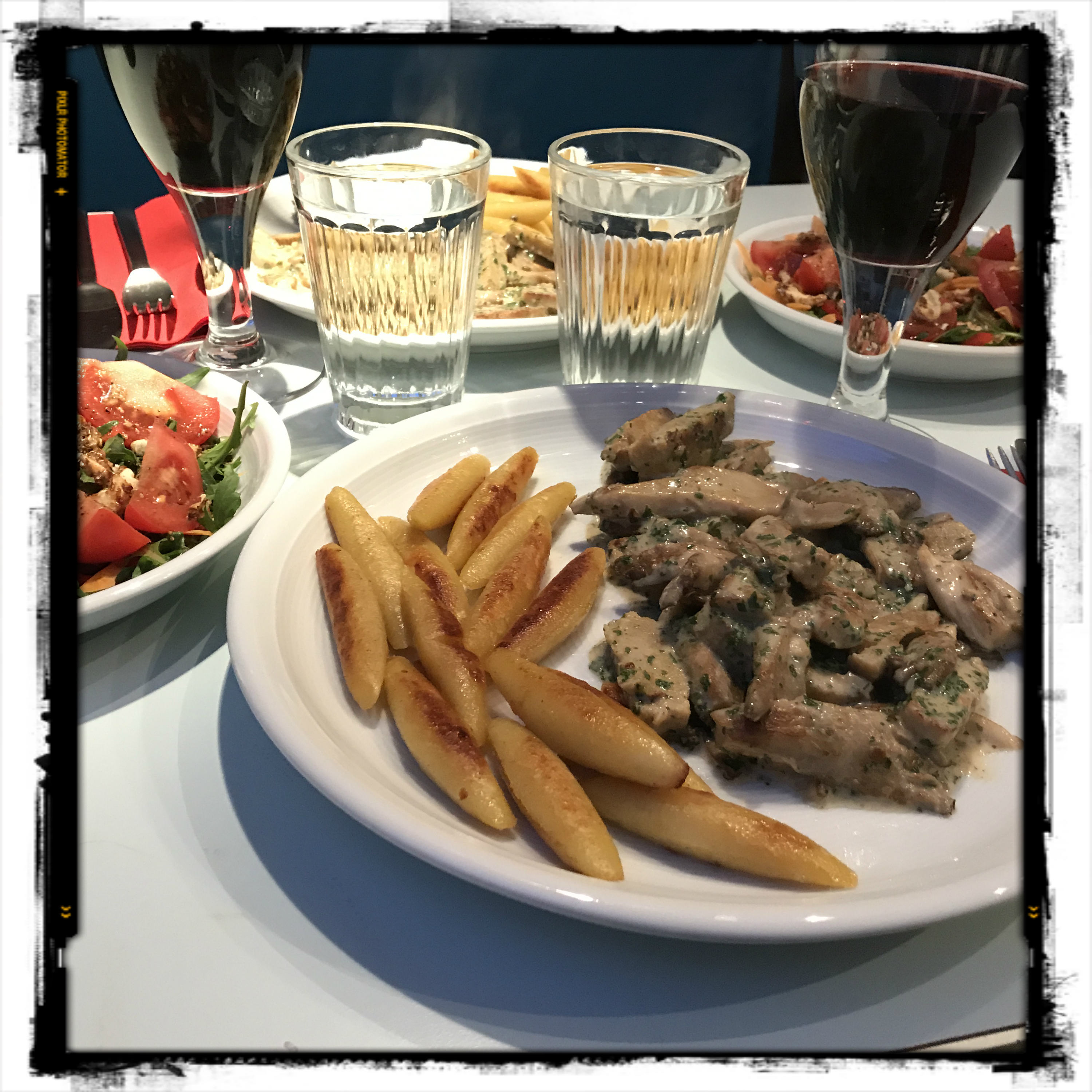 Geschnetzeltes mit Schupfnudeln auf zwei vorgewärmte Teller geben und mit dem Salat servieren