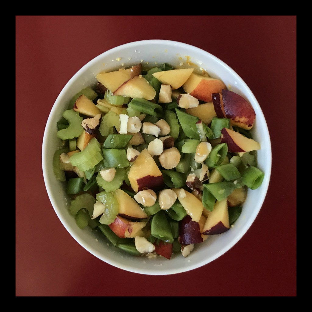 2 kleine Pfirsiche in kleine Stücke schneiden, alles auf den Hüttenkäse geben, mit