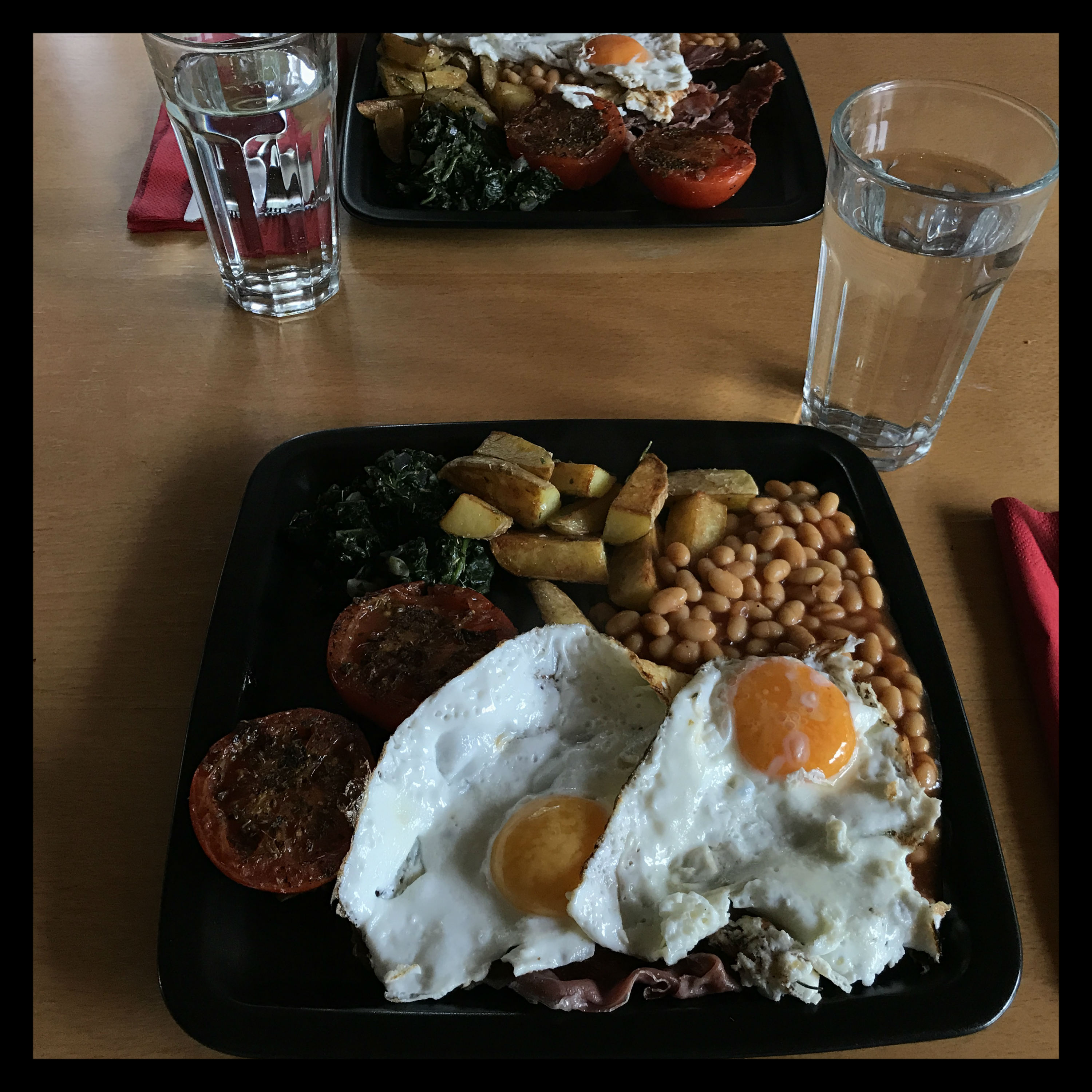 Kartoffeln, Bohnen (evtl. nicht mit der kompletten Tomatensauce) und den Spinat auf die vorgewärmten Teller geben, zum Schluss die Spiegeleier auf den Schinken setzen