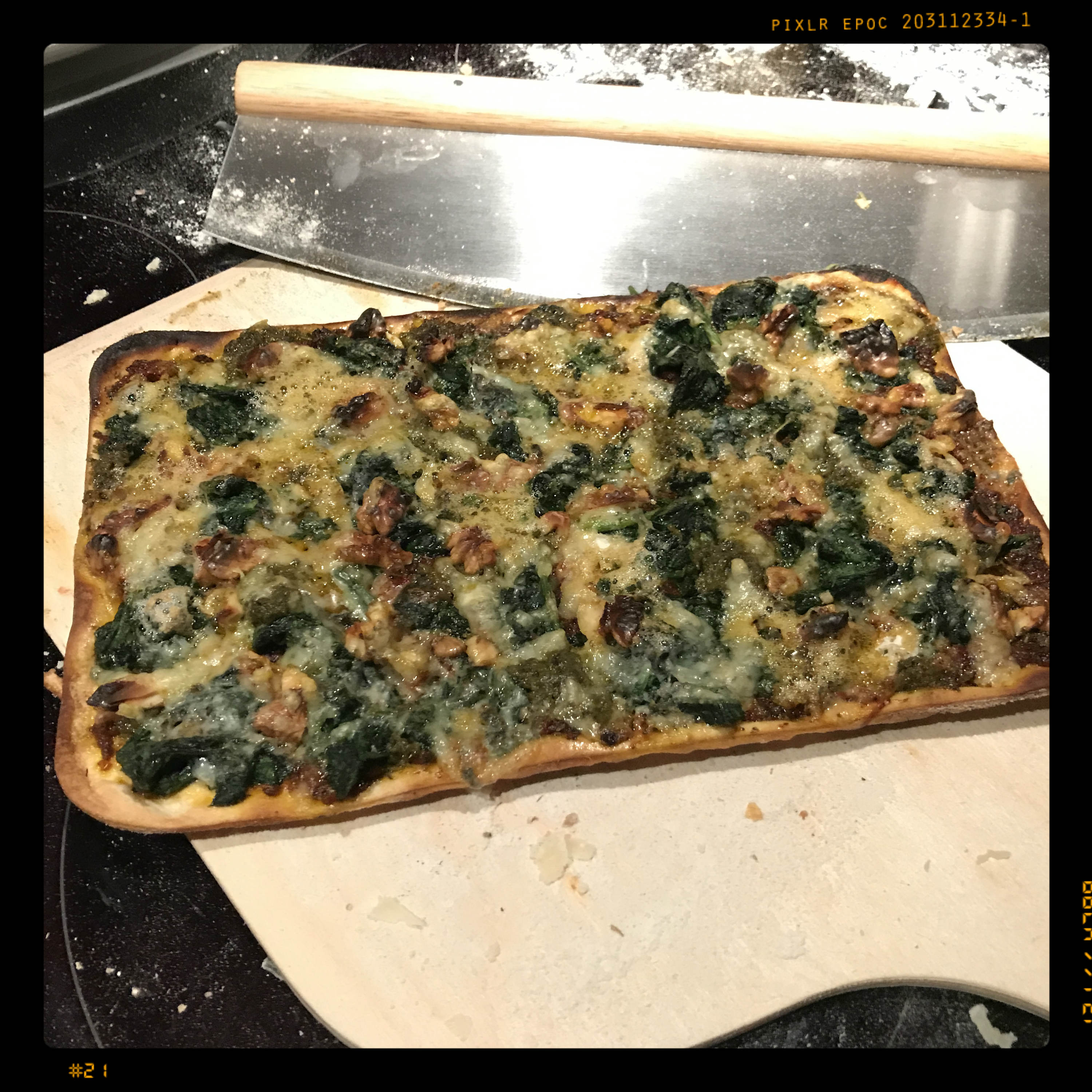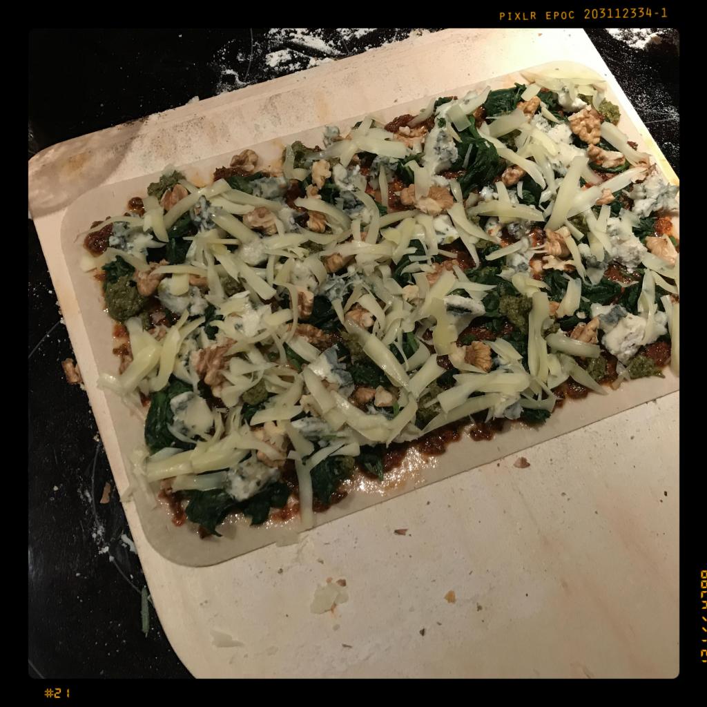 bemehlten Pizzaschieber mit der Tomatensauce bestreichen, den Spinat (in Küchenkrepp gut ausgedrückt),