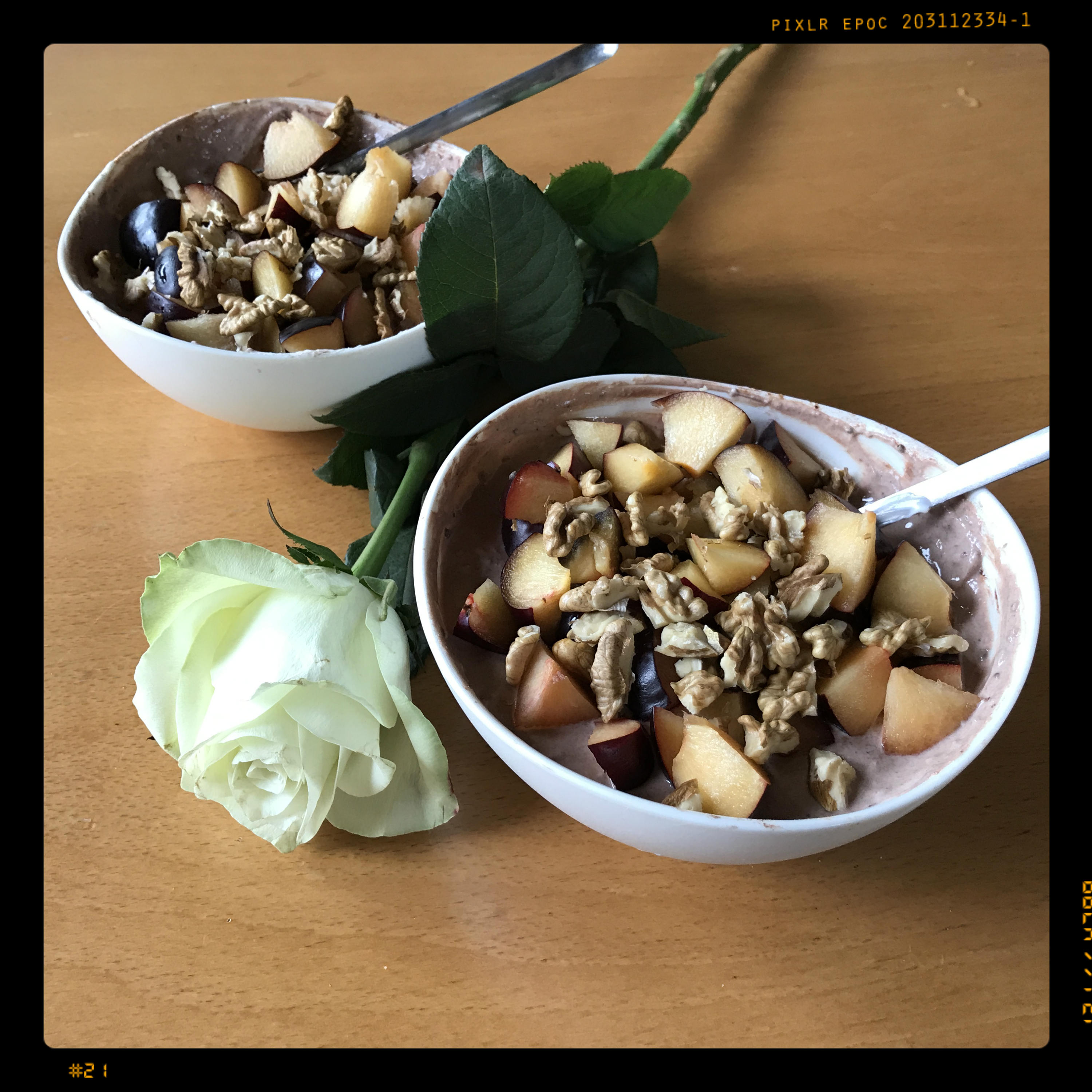 2 Pflaumen in kleine Stücke schneiden, auf dem Joghurt verteilen und mit
