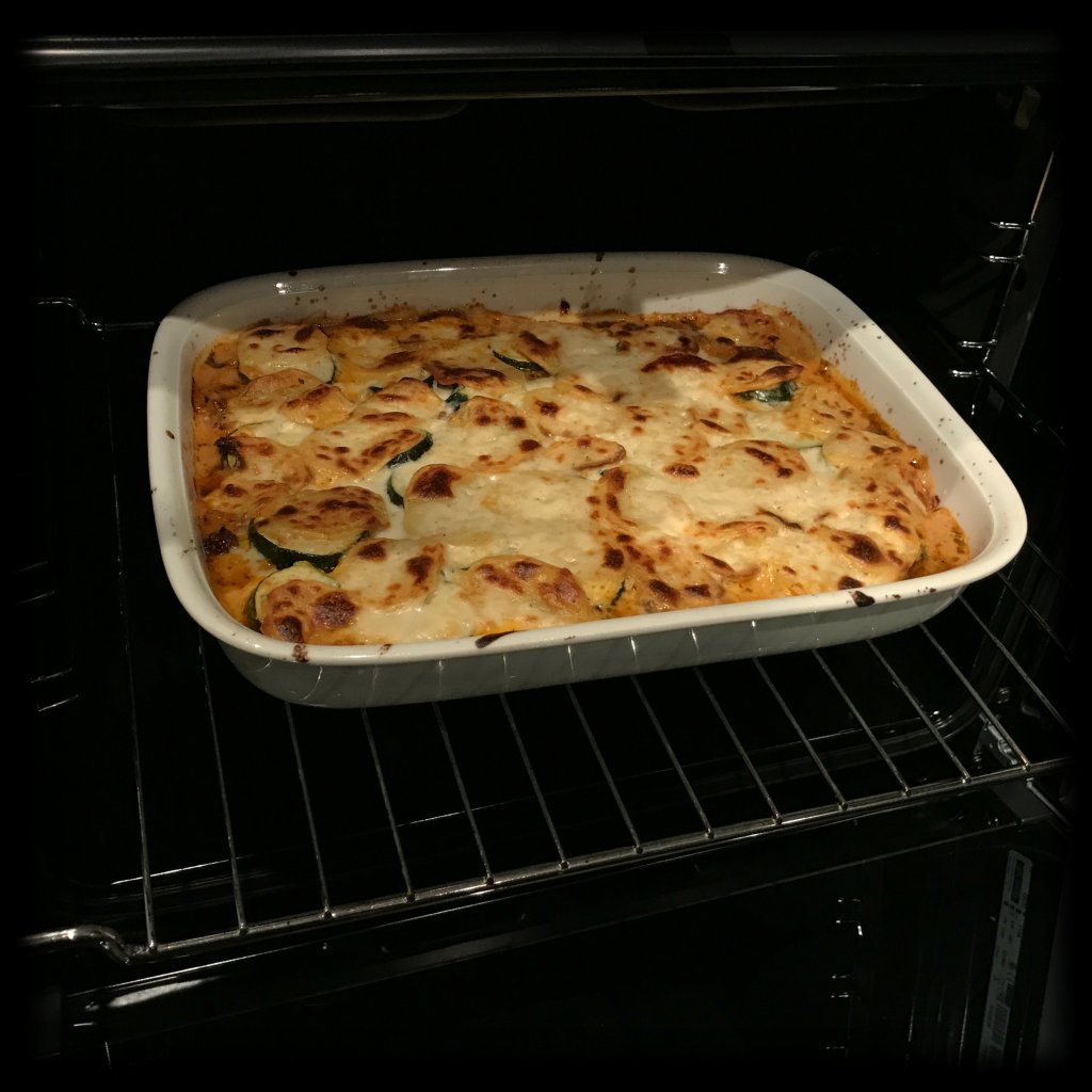 die Auflaufform zuerst mit der Hälfte der Zuchinischeiben auslegen, dann die Hackflleischsauce darübergeben, mit den restlichen Zucchinischeiben und anschließend den Kartoffelscheiben bedecken und zum Schluss die Bechamelsauce darüber verteilen, alles auf der mittleren Einschubleiste ca. 20 Min. backen, bis die Oberfläche leicht gebräunt ist