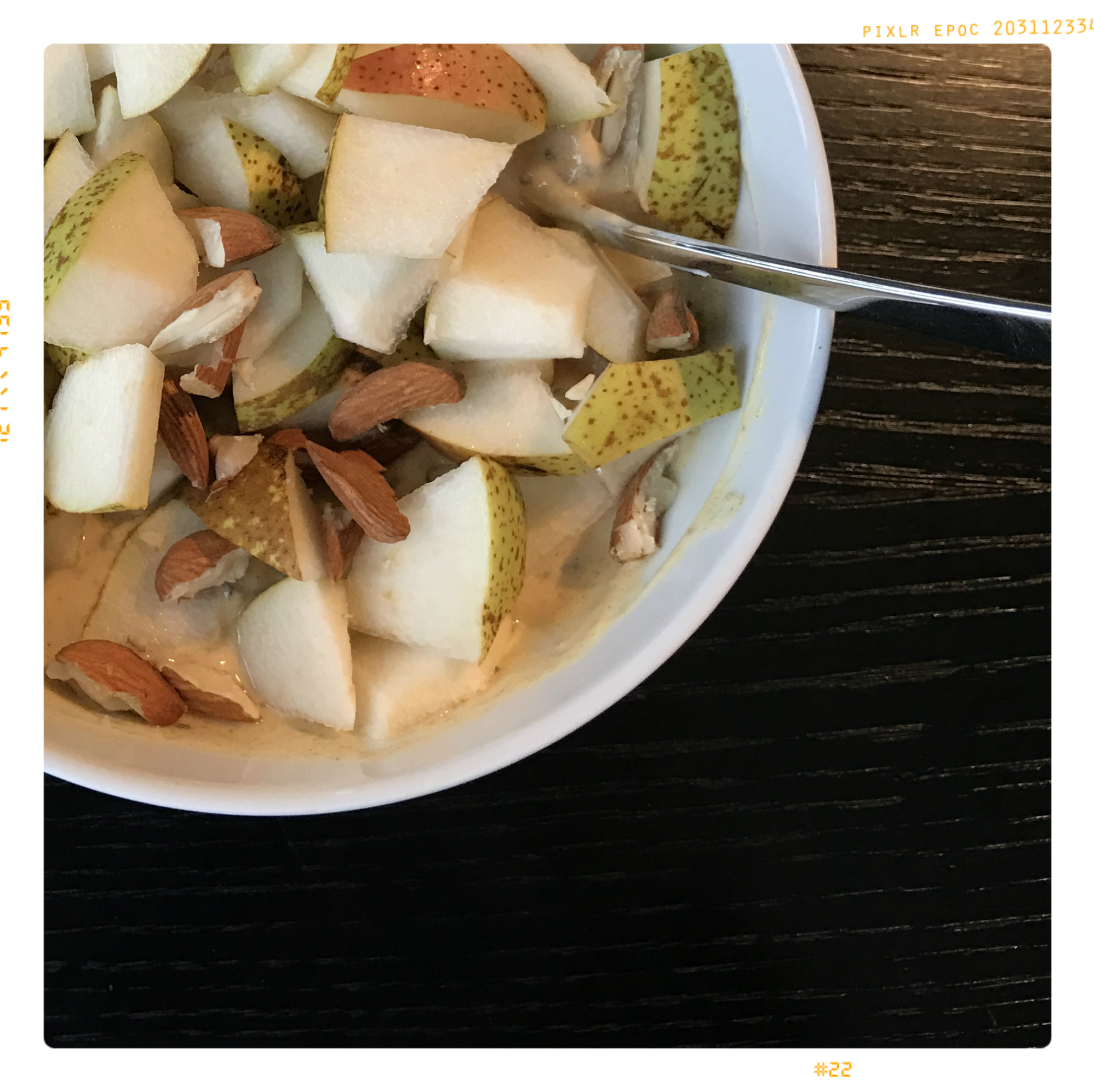 1 Birne kleinschneiden, auf dem Joghurt verteilen und mit