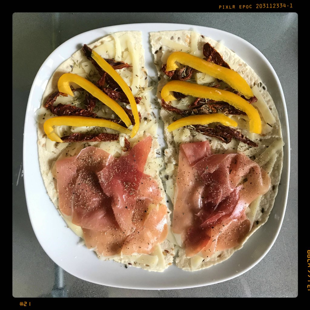 1 Weizen-Tortilla (mit Chiasamen) in der Mitte teilen und mit