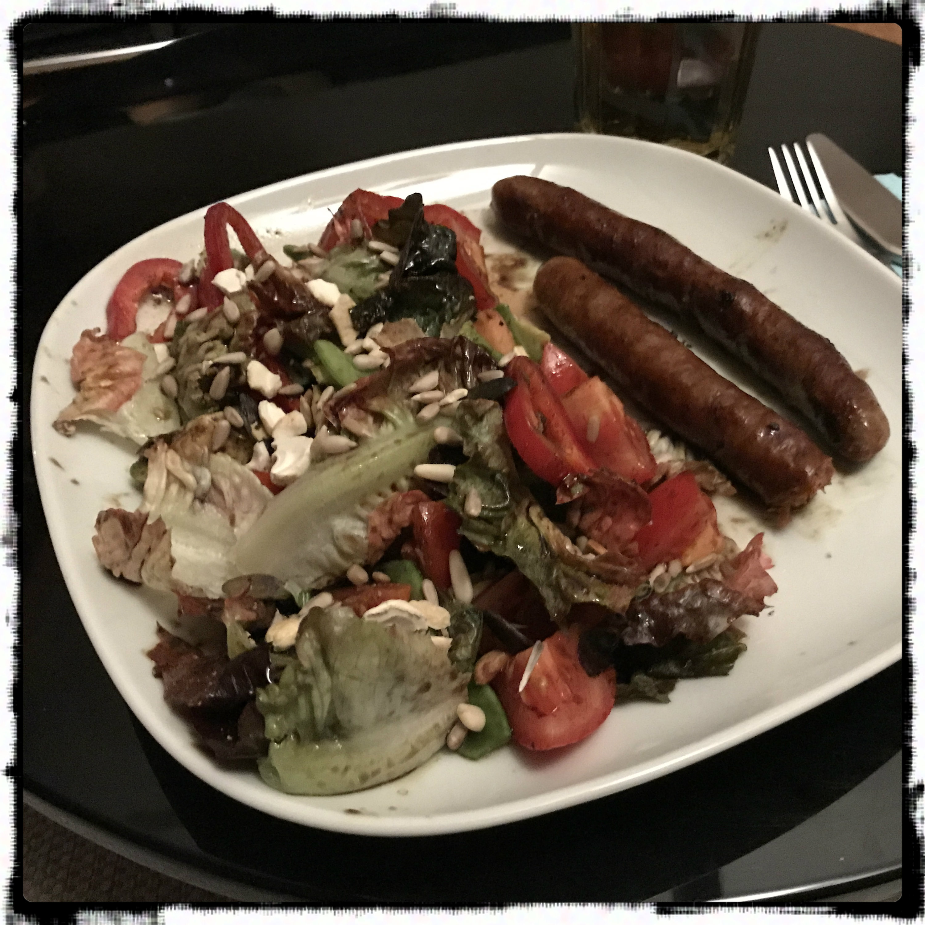 frisch gemahlenem schwarzen Pfeffer mischen und die abgekühlten Salatkerne darüberstreuen, den Salat mit den Merguez servieren