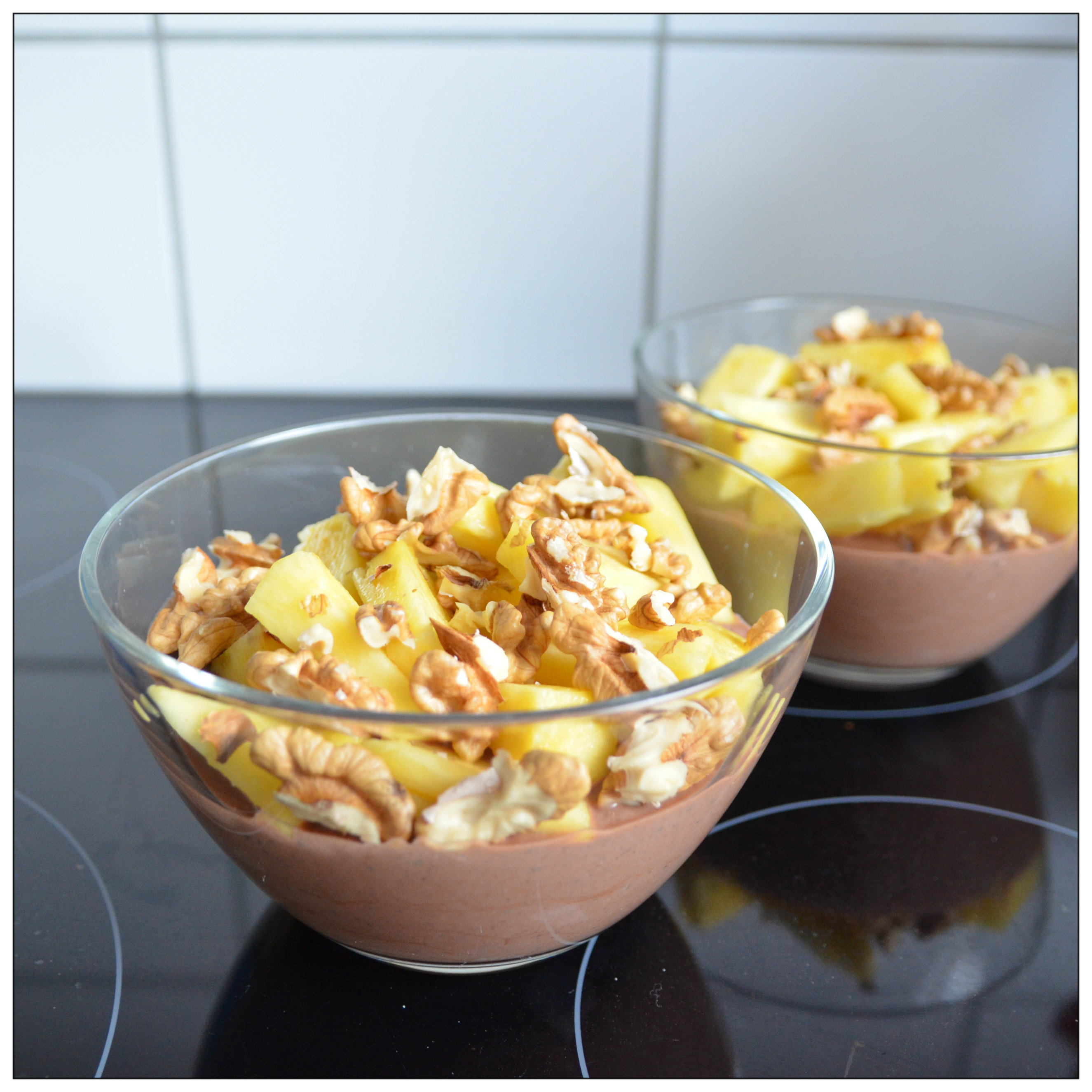 1 Scheibe Ananas (ca. 1,5 – 2 cm dick) in kleine Stücke schneiden, auf dem Joghurt verteilen und mit