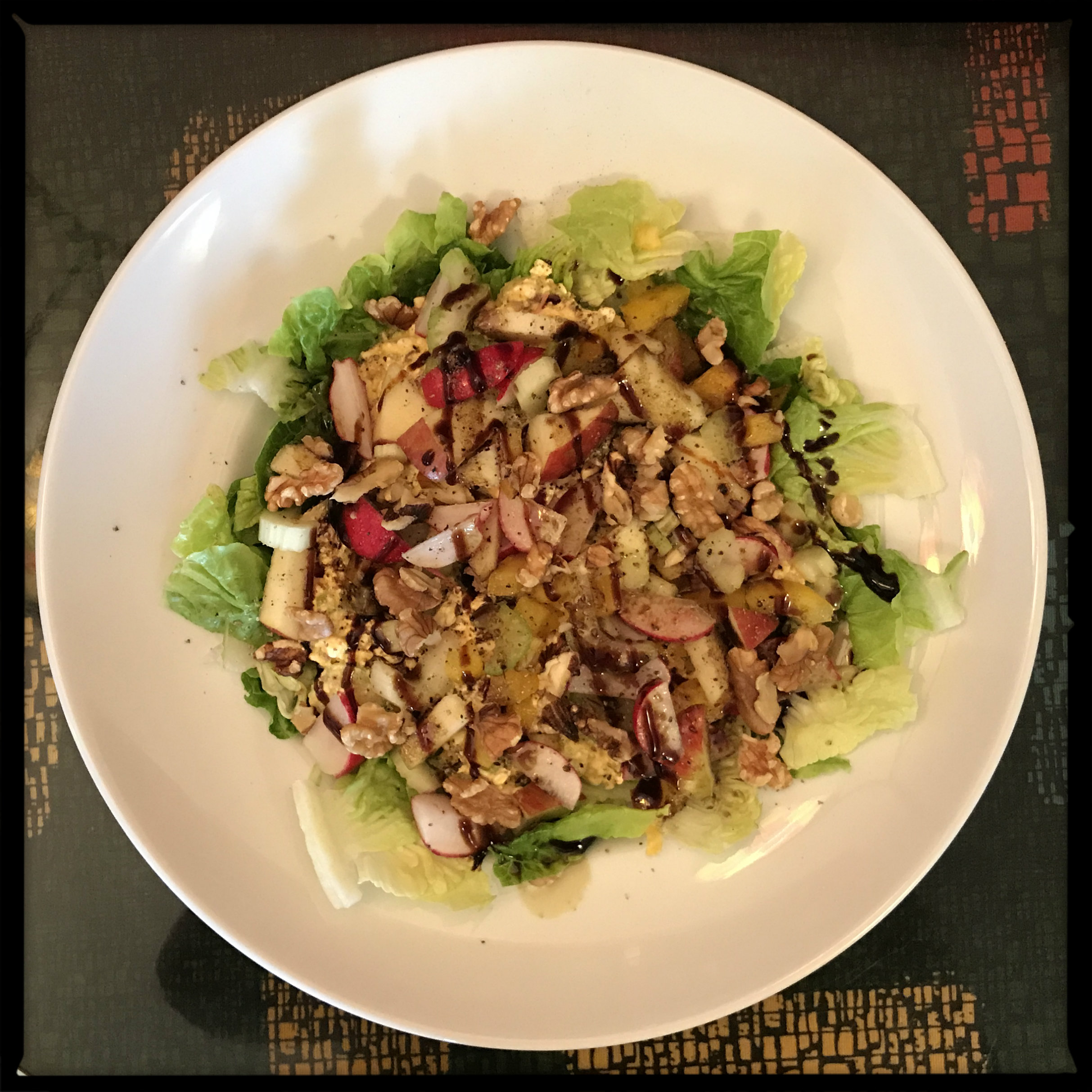 die Hälfte des Obsts und Gemüses unter den Hüttenkäse mischen, die Hüttenkäsemischung auf die Salatblätter geben und das restliche Obst und Gemüse auf dem Hüttenkäse verteilen, mit