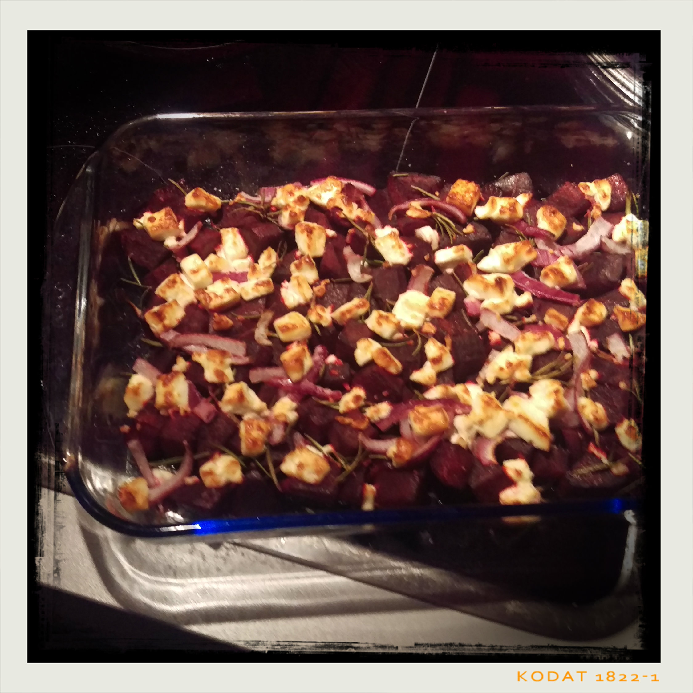 1 EL Bratolivenöl einfetten, dann die roten Bete hineingeben und Zwiebel, Rosmarin und Schafskäse darauf verteilen, mit