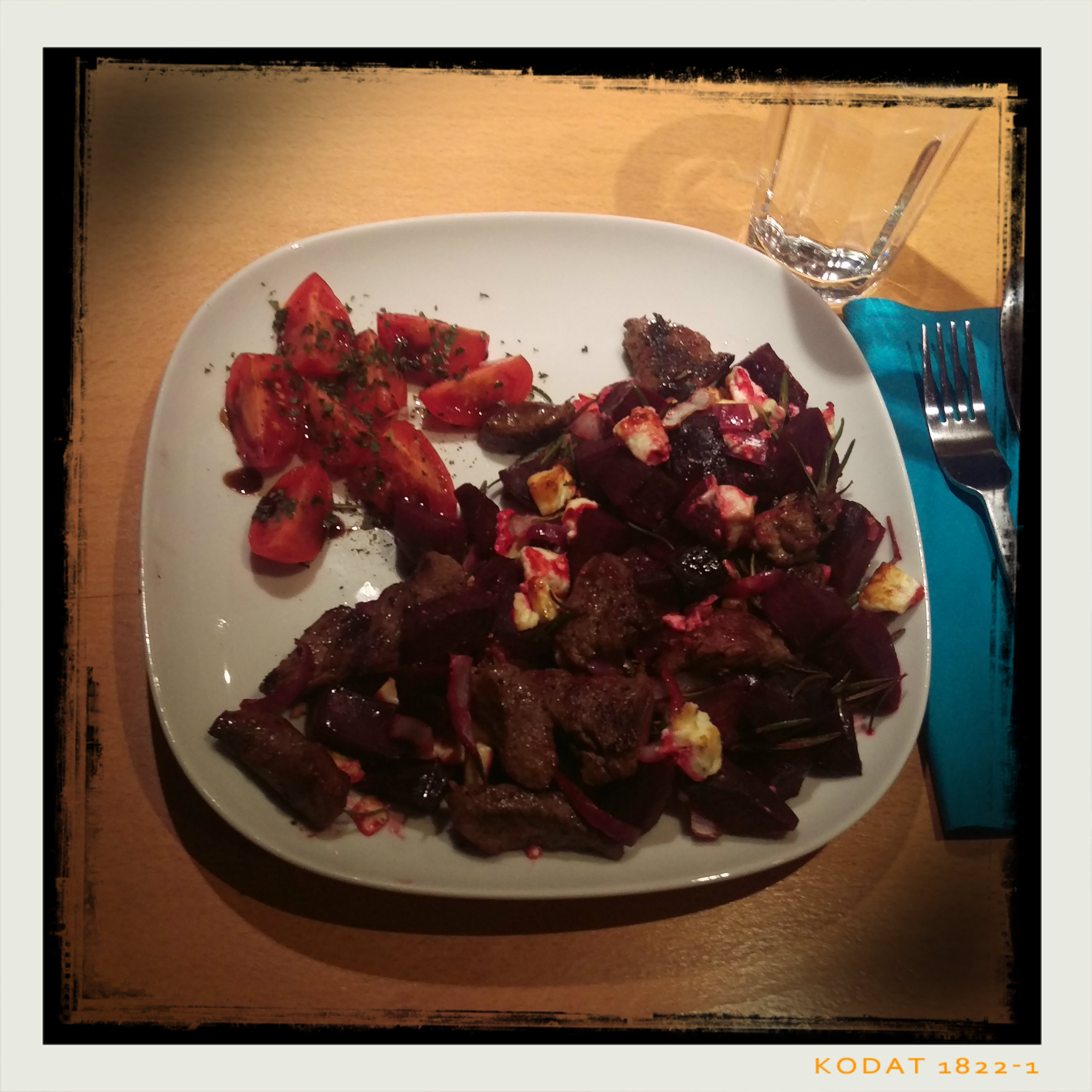 ein paar Spritzern Balsamico-Crema dekorieren, dann die Lammfiletstreifen und das Gratin dazu geben